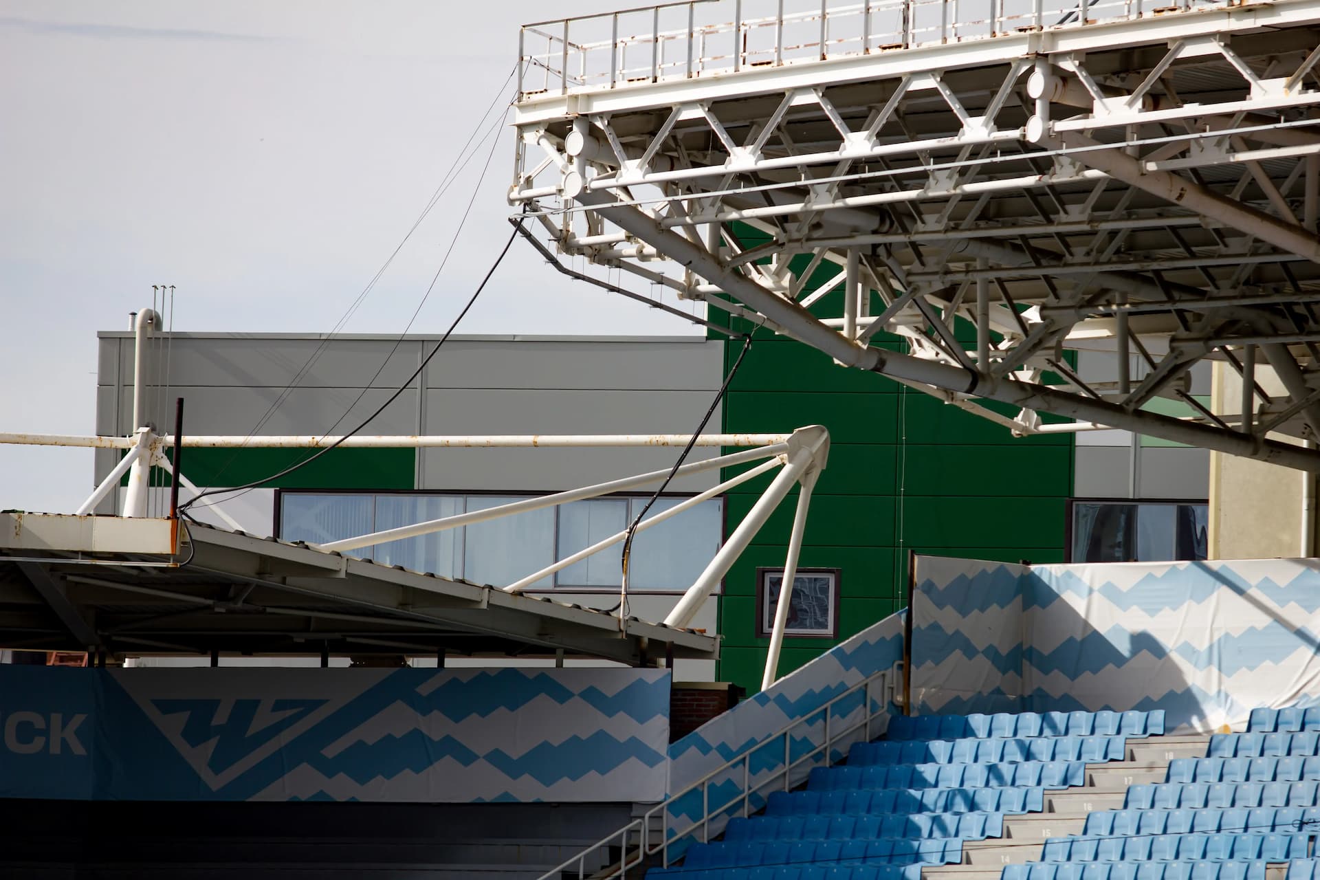При выходе к кромке, сразу бросились в глаза особенности строения стадиона. Новый брендинг клуба соседствует с повидавшими виды конструкциями арены