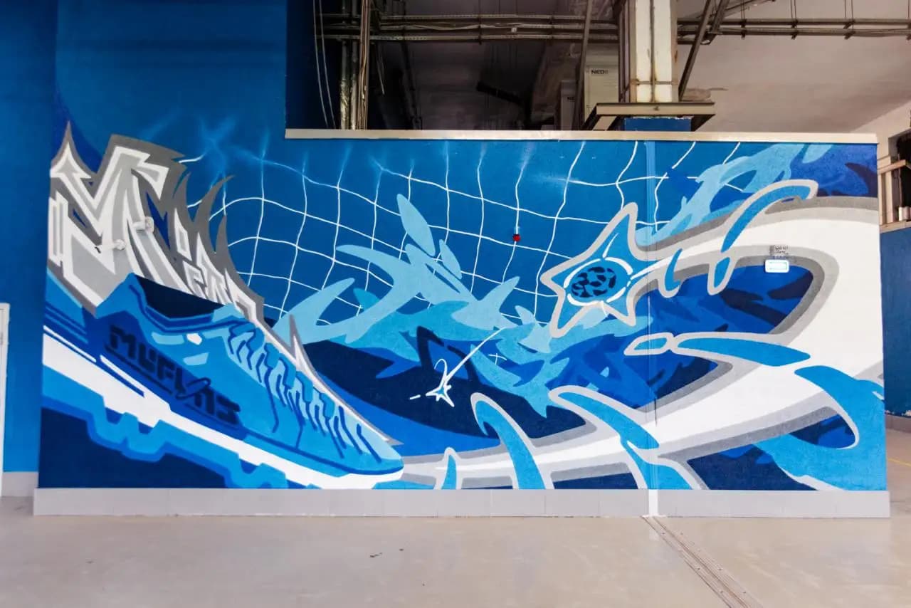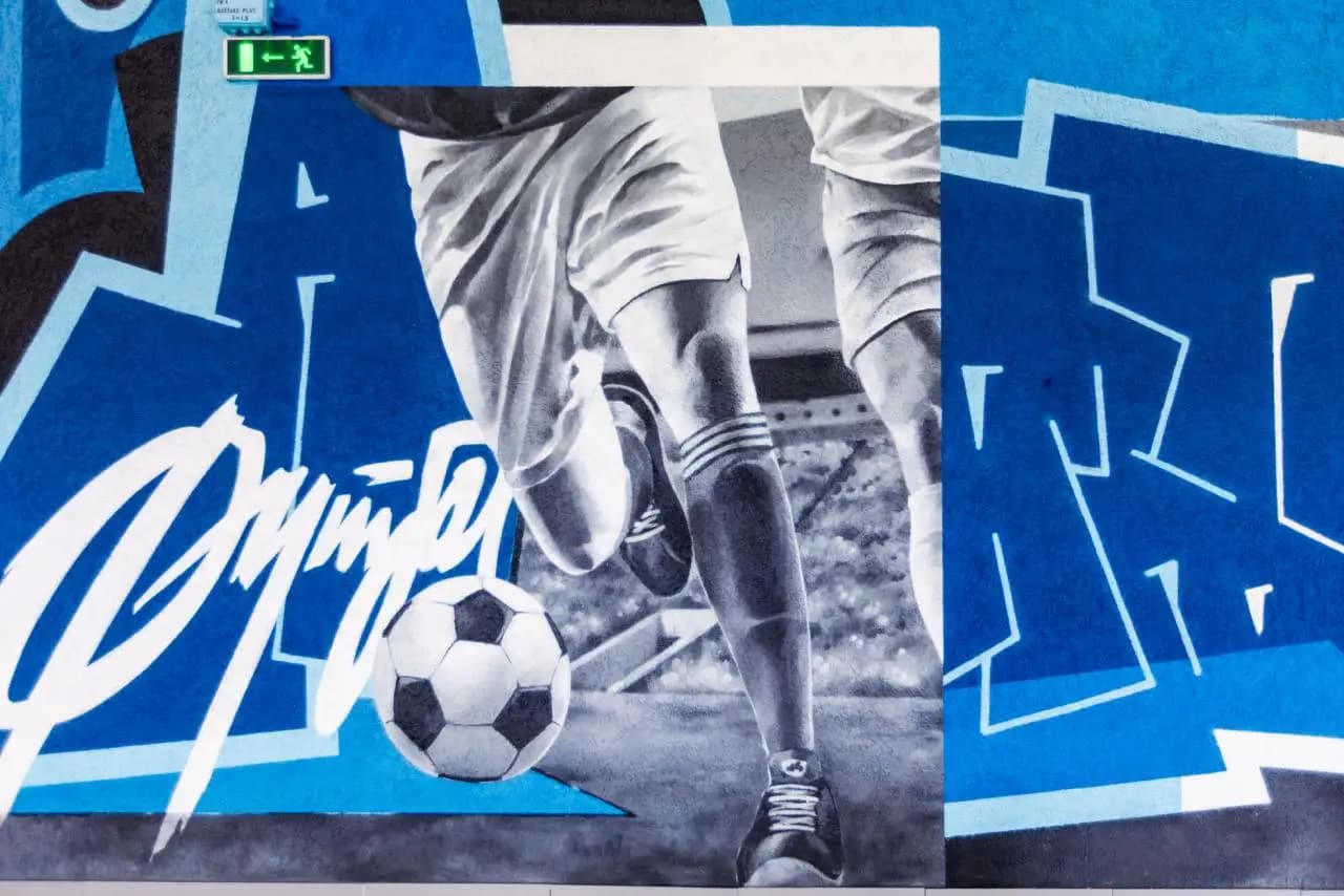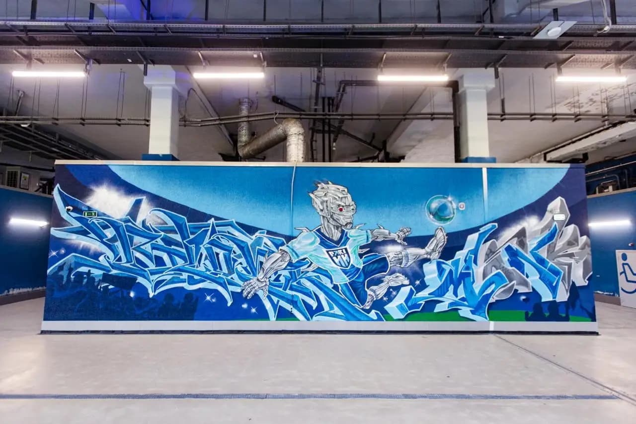 В центре огромной художественной композиции – слияние родных клубу цветов и знакомых каждому болельщику символов: удар по мячу, богиня Ника – покровительница победы, силы и скорости – и Канавинский мост
