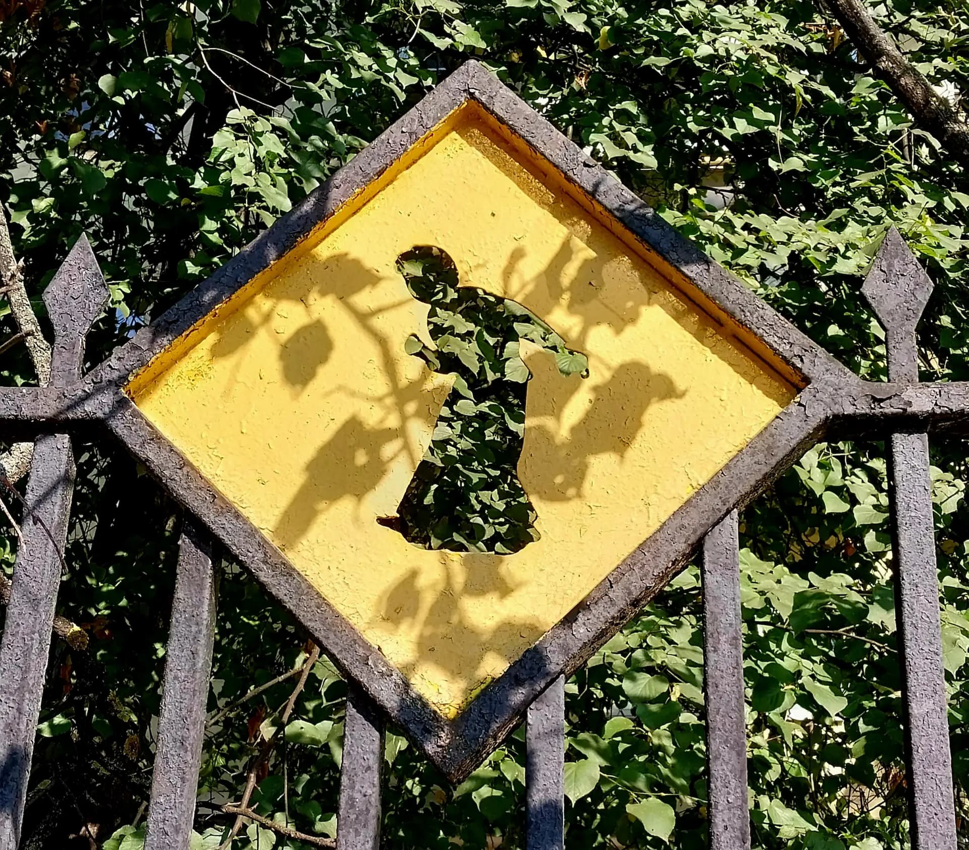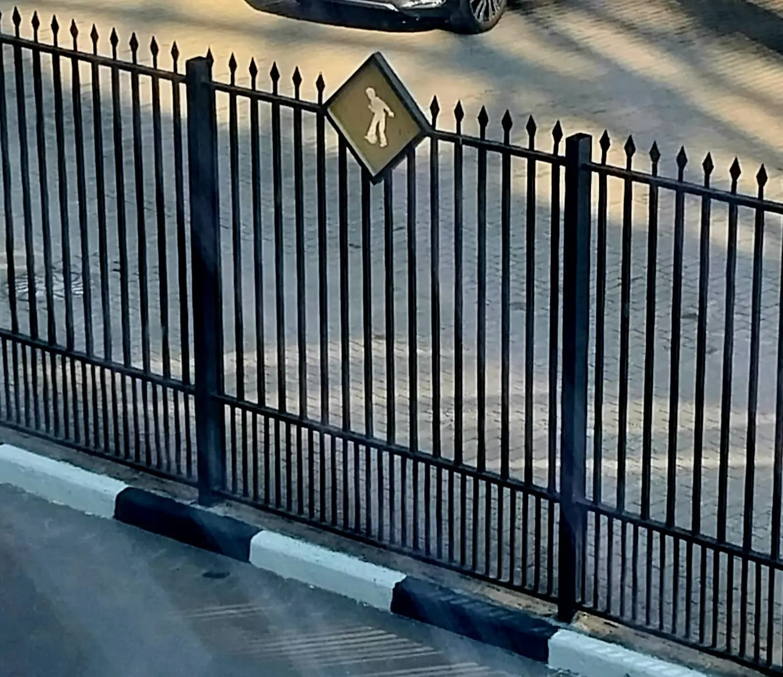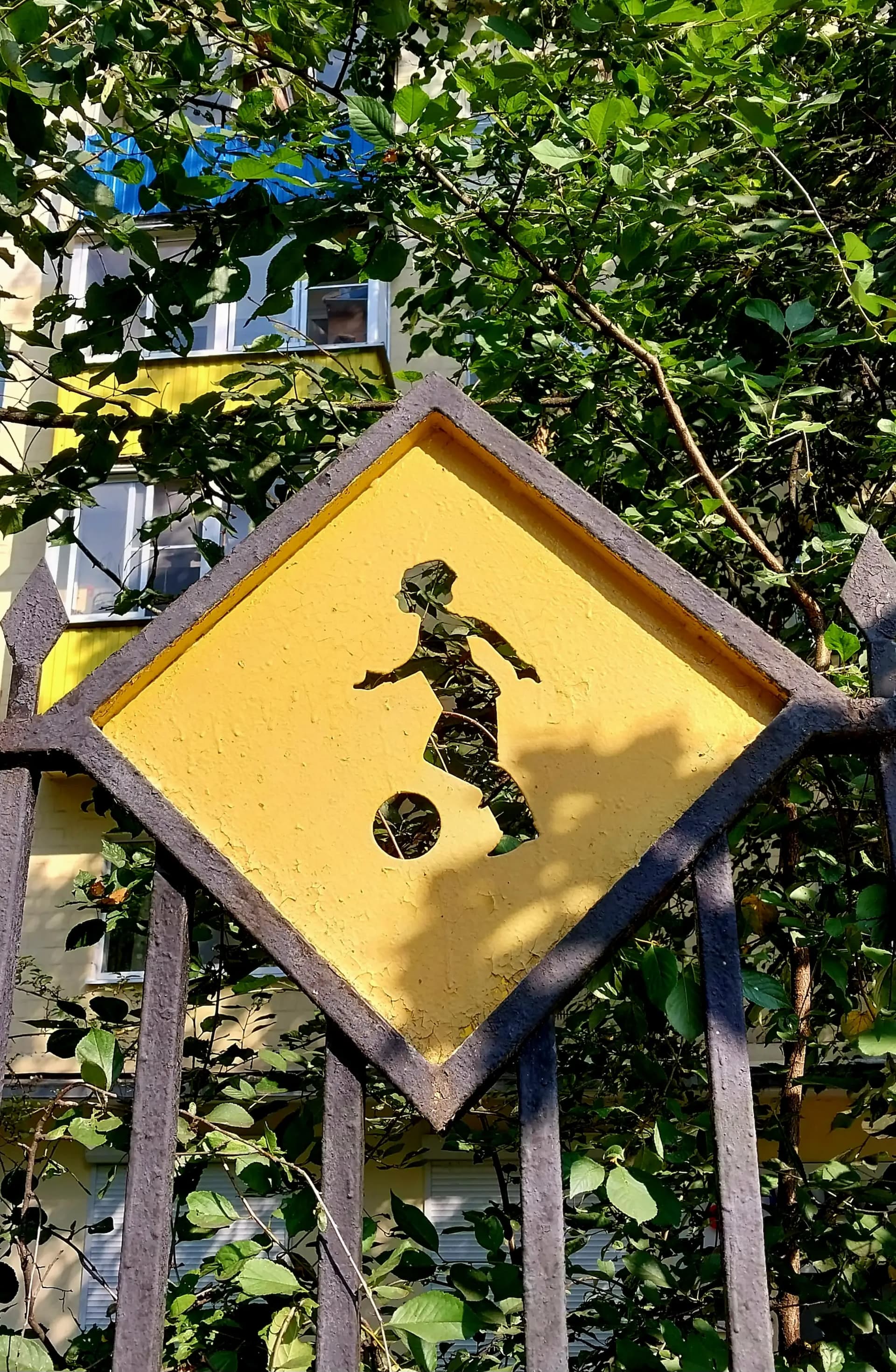 Ограда простая — стальная решетка из скрепленных пик. Главное украшение — желтые ромбы с чередующимся трафаретом в виде мальчика с мячом