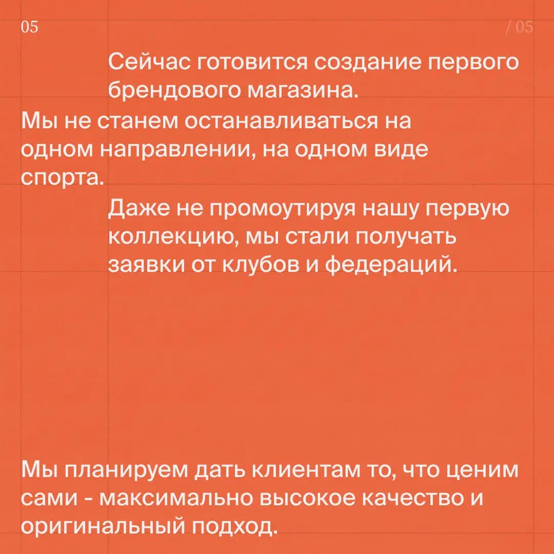 Конечно, мы не станем останавливаться на одном направлении, на одном виде спорта. Достаточно сказать, что мы, даже не промоутируя нашу первую коллекцию, стали получать заявки. Запросы поступают от клубов и федераций. Деталей пока раскрыть не могу, но как и говорил, мы планируем не сверкнуть на рынке, а дать клиентам то, что ценим сами — максимально высокое качество и оригинальный подход.