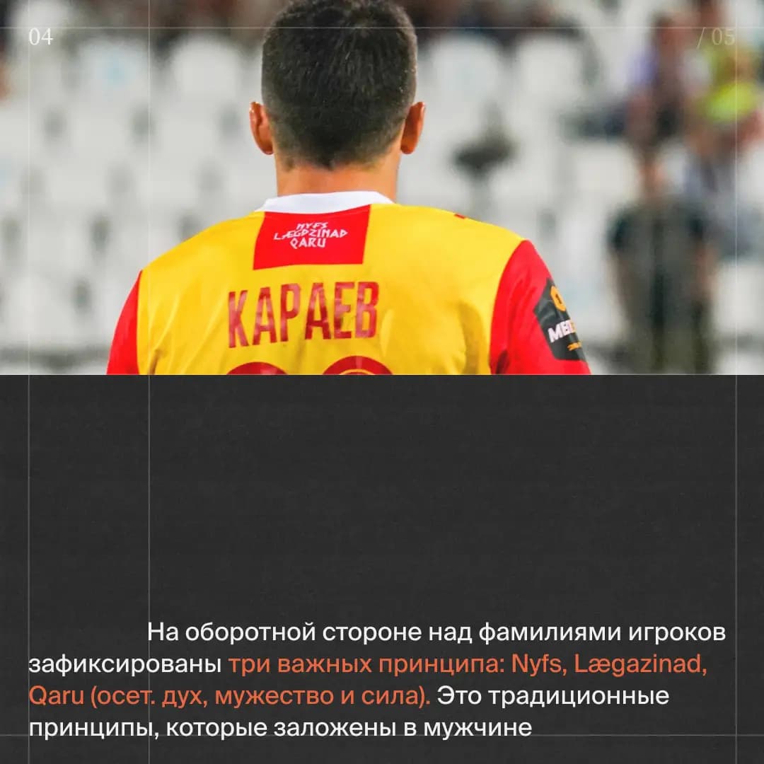 На оборотной стороне над фамилиями игроков зафиксированы три важных принципа: Nyfs, Lægdzinad, Qaru (осет. дух, мужество и сила). Это традиционные принципы, которые заложены в мужчине.