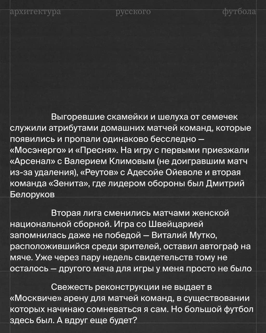 На поле «Москвича» выходила женская сборная России и участники мужского кубка России. Несколько лет хозяином поля был ФК «Мосэнерго», фанаты которого выпускали свой фанзин.