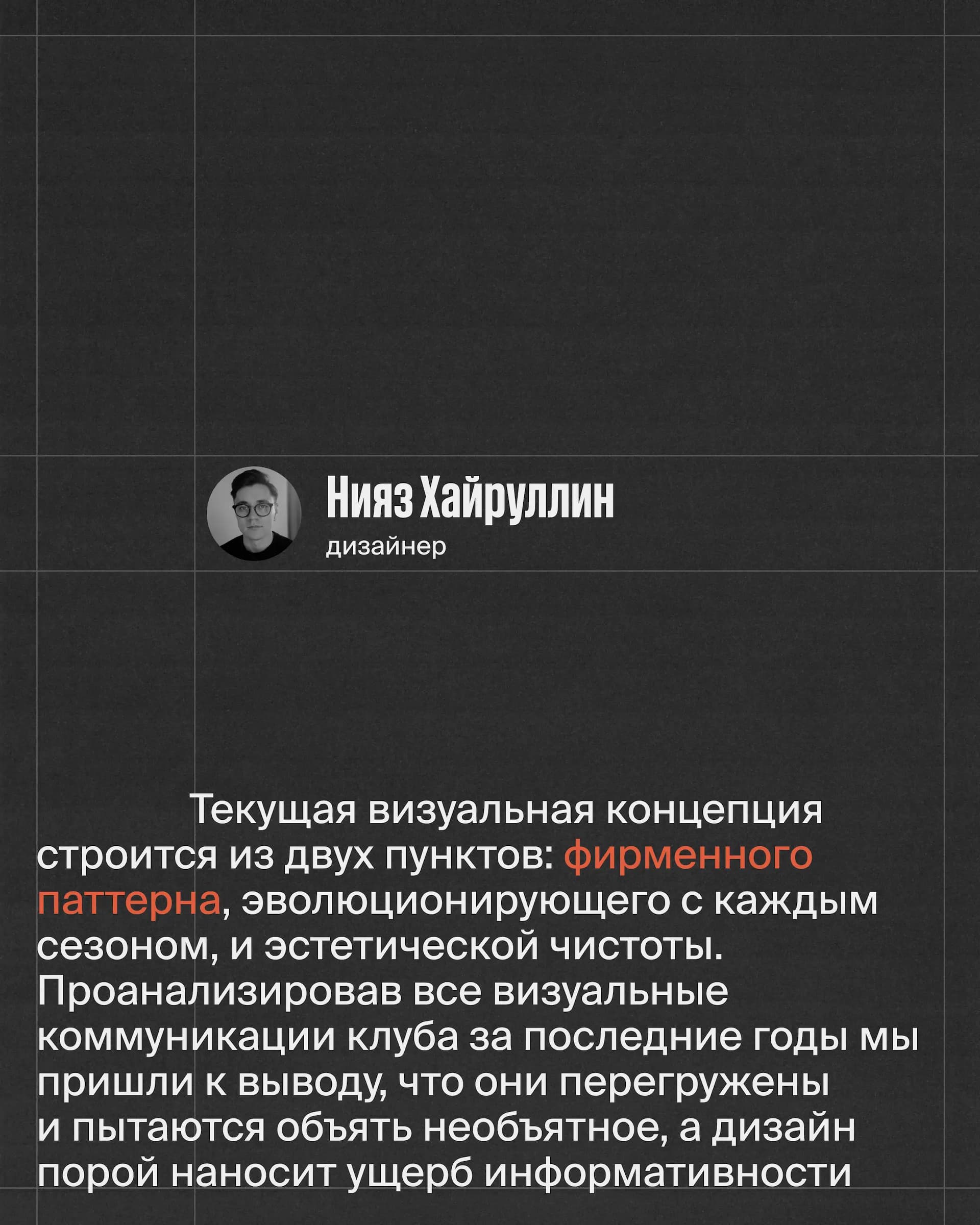 Исходя из этой вводной мы решили максимально очистить социальные сети и остальные носители от визуального шума, сейчас мы только в начале этого пути: активно начали использовать белый цвет в качестве основного фона, простые шрифтовые гарнитуры. А для таких носителей как клубный транспорт или брендированные локации в городе мы используем наш клубный паттерн, состоящих из основных 10 и элементов и 4 переменных меняющихся и обновляющихся от сезона к сезону