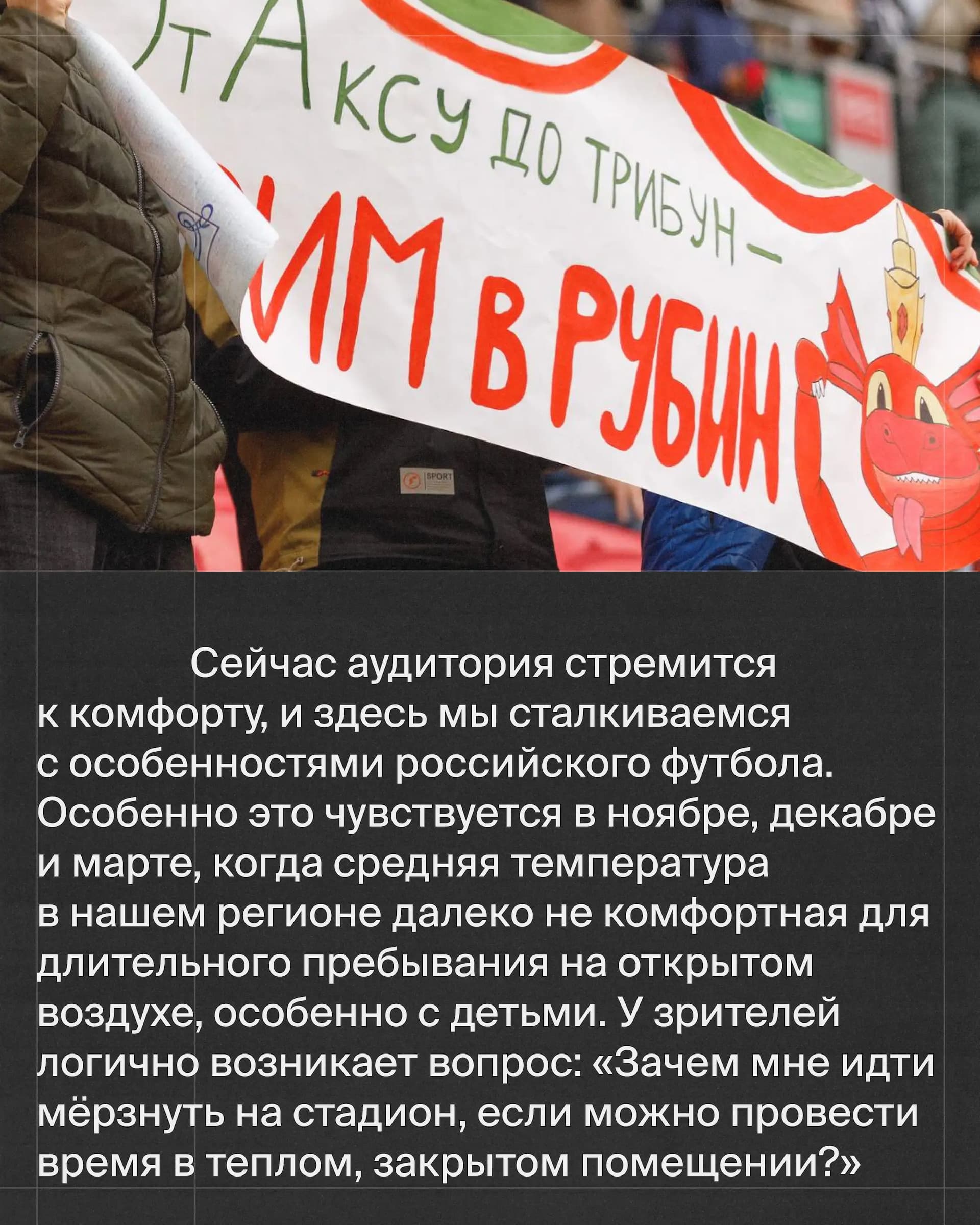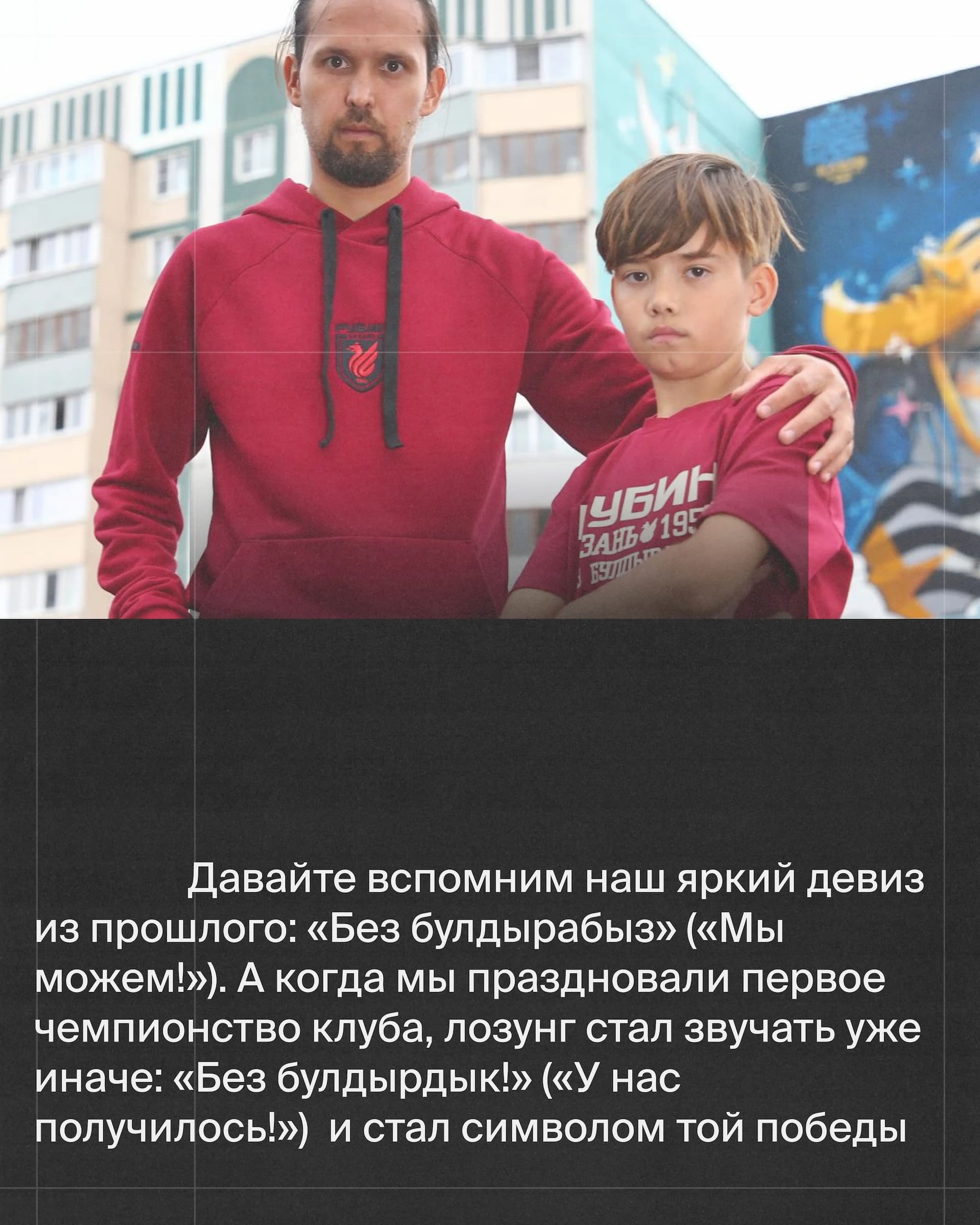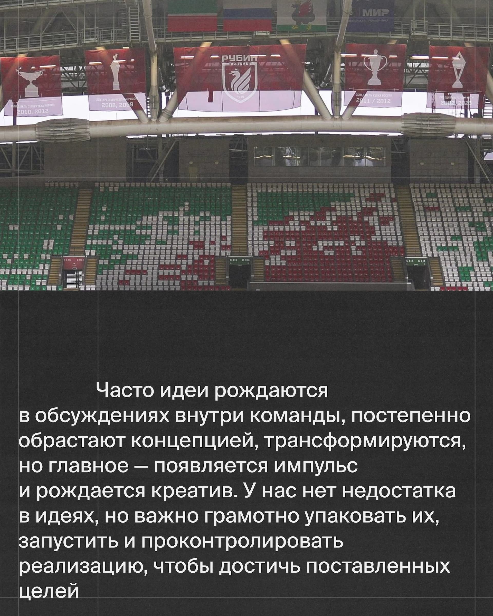 А теперь добавьте к этому яркую и насыщенную историю нашего клуба. Накладывает ли всё это отпечаток на нашу идентичность? Конечно! Это формирует не только визуальный образ «Рубина», но и его философию. «Рубин» — не просто футбольная команда, а символ единства, традиций и амбиций всего региона