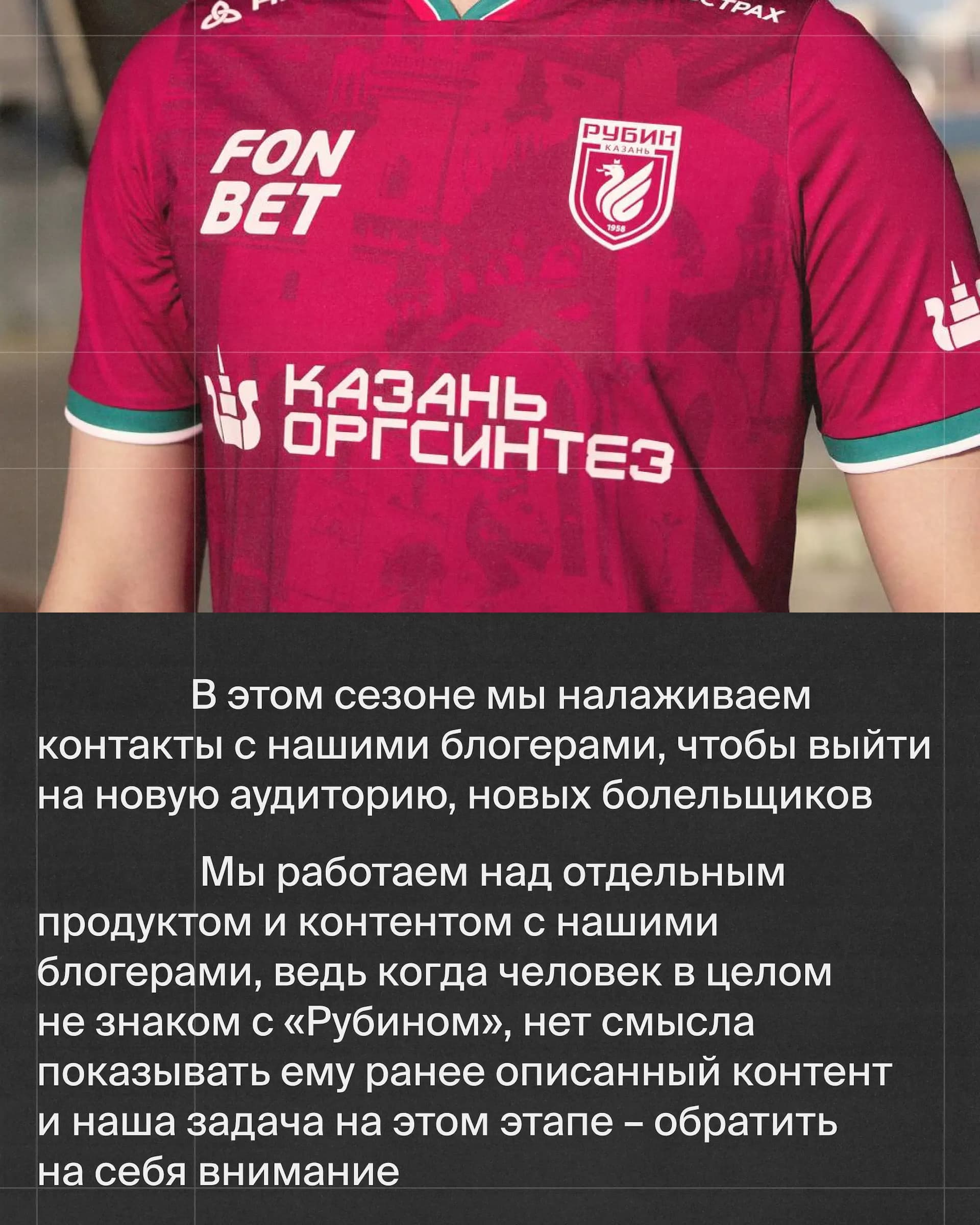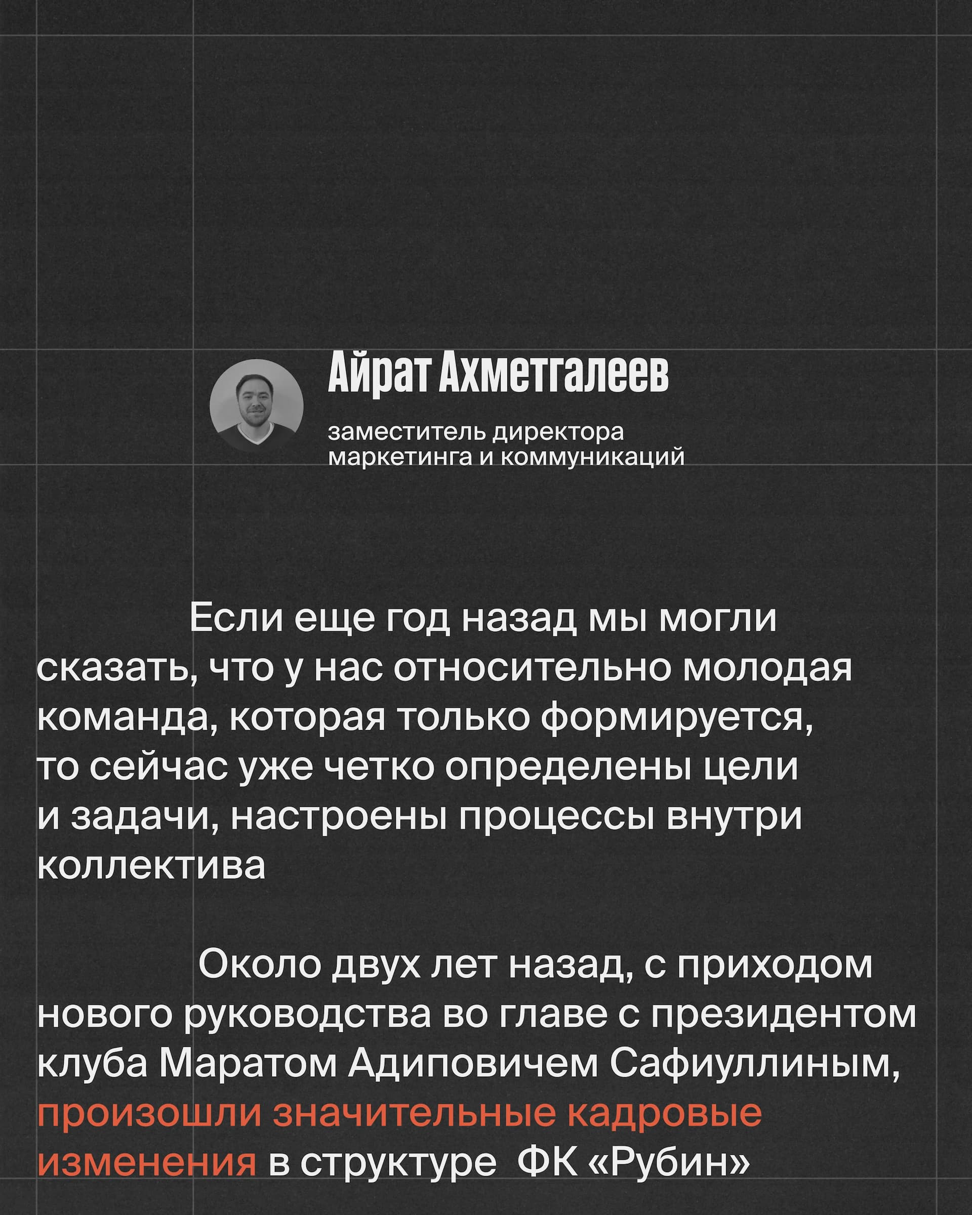 «Рубин» в рамках творческого и креативного направления – это три ключевых департамента: коммерческий, маркетинговый и медиа. У каждого из них свои задачи, но все они ведут к достижению общих целей: росту базы болельщиков (как в соцсетях, так и в CRM-системе), увеличению посещаемости домашних матчей, а также реализации коммерческих задач, которые являются приоритетом клуба