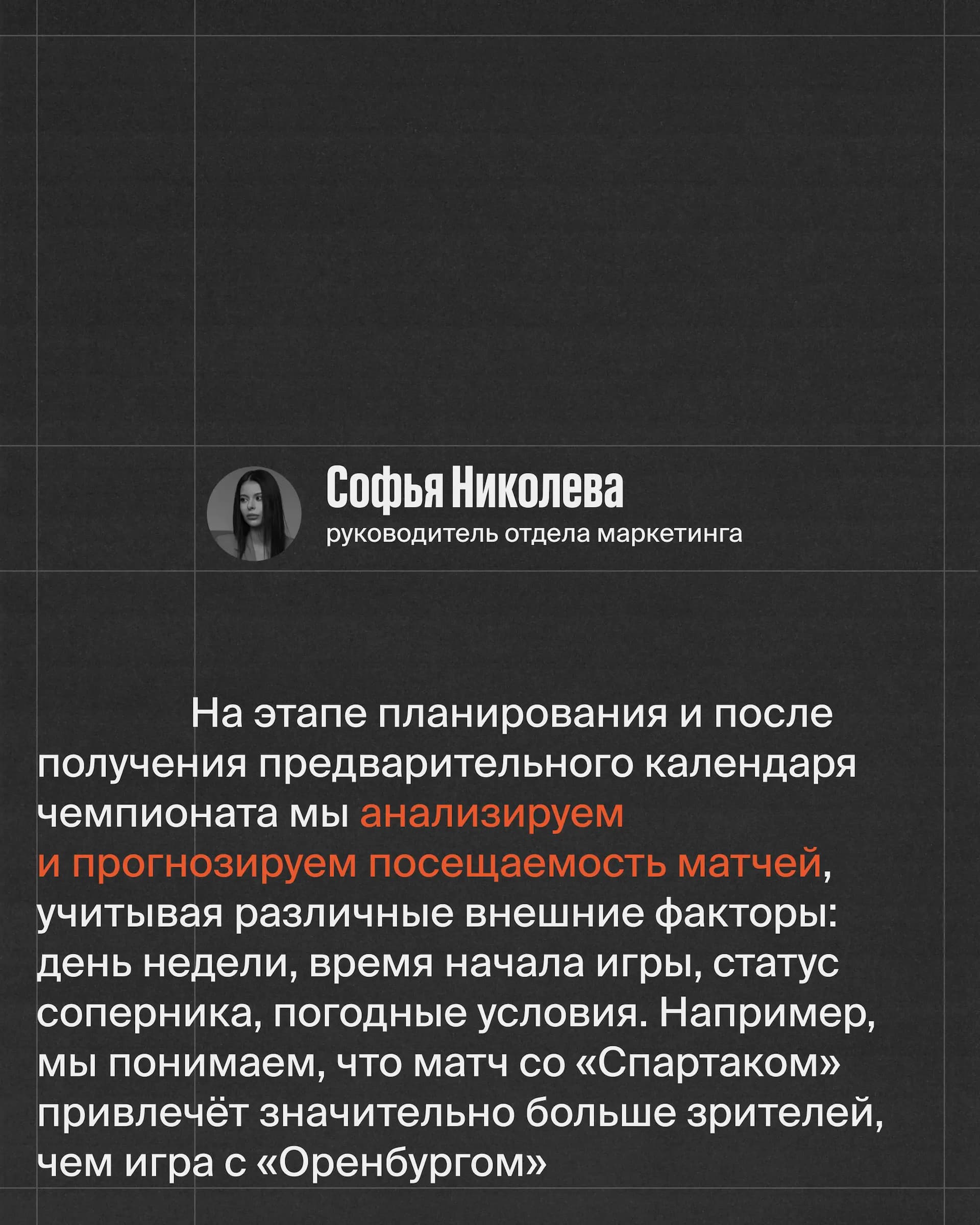 Но работа клуба не должна зависеть только от результатов команды на поле – в этом и заключается наша работа. Даже если команда побеждает, а на стадионе не так качественно работают сервисы, нет комфортных условий – это точно не даст буст к посещаемости