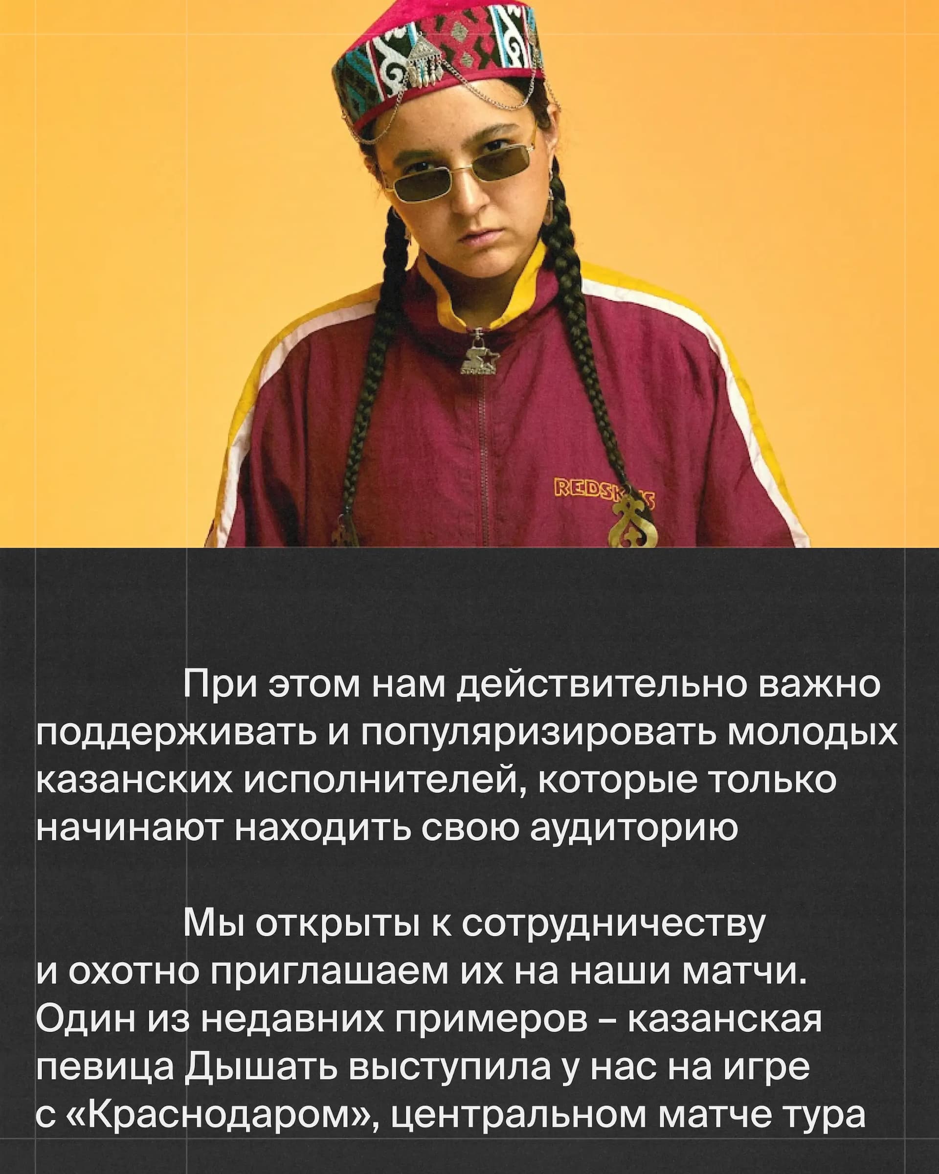 На матчах можно услышать татарскую музыку, увидеть выступления коллективов с национальными инструментами и танцами. Мы довольно часто уделяем этому особое внимание, потому что хотим, чтобы гости города прочувствовали уникальный колорит региона