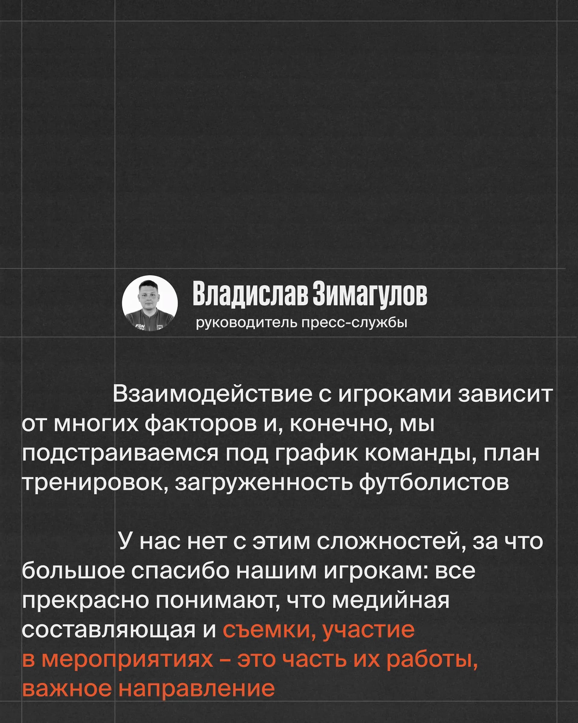 Да, бывает, что футболист может «закрыться», почувствовав, что его стало много в инфополе. Тут важно сохранять этот баланс. Многие наверняка заметили, что Руслан Безруков в последнее время меньше появляется в наших соцсетях. Зато Мирлинд Даку или, к примеру, Олег Иванов стал появляться чуть чаще. Это нормально, что в разные периоды один игрок охотнее участвует в наших медийных историях, а другой чувствует, что пока лучше взять паузу. В целом эта работа выстроена на человеческих отношениях с ребятами