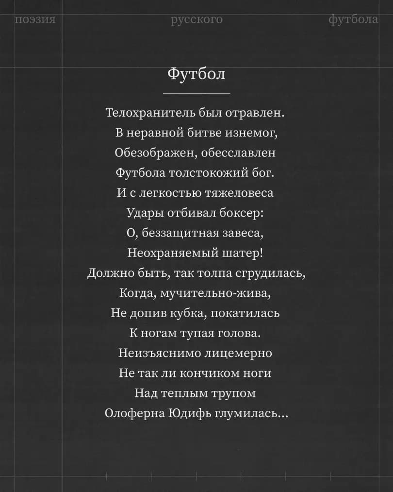 Осип Мандельштам также отказывается от упоминания Англии в своем стихотворении «Футбол» (1914). Вместо этого он обращается к ветхозаветной истории, сравнивая мяч с головой полководца Олофрена, которая была отрублена иудейкой Юдифью. Примечательно, что это произведение не вошло в его первый поэтический сборник «Камень» (1915), поскольку Мандельштам здесь экспериментирует с новым, не акмеистическим направлением творчества
