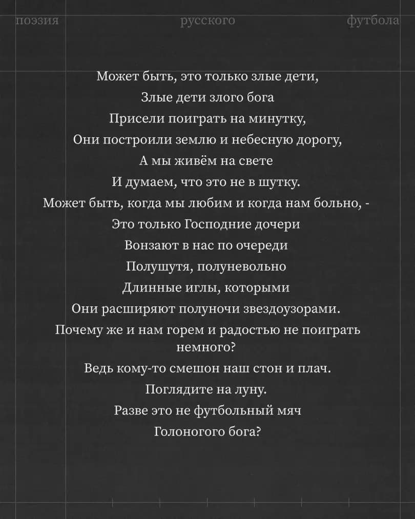 Обращаясь к теме футбола, поэты обычно сосредотачивали взгляд либо на самих футболистах, либо на толпе зрителей, но вот мяч – предмет, за которым следят все участники матча, редко оказывался главным героем стихотворения. На этот аспект обратили внимание модернисты – Константин Липскеров, Валерий Брюсов, Осип Мандельштам. Так, например, Константин Липскеров сравнивает мяч с небесным телом («Поглядите на луну. // Разве это не футбольный мяч // Голоногого бога?») (1915)