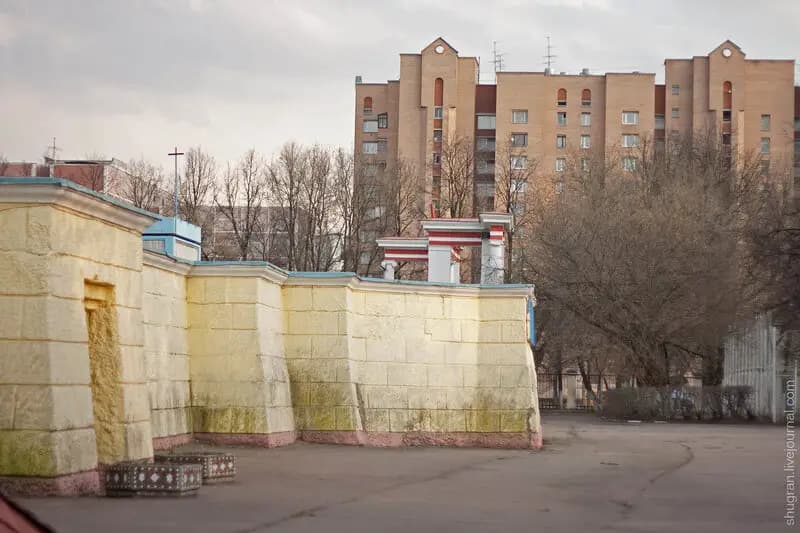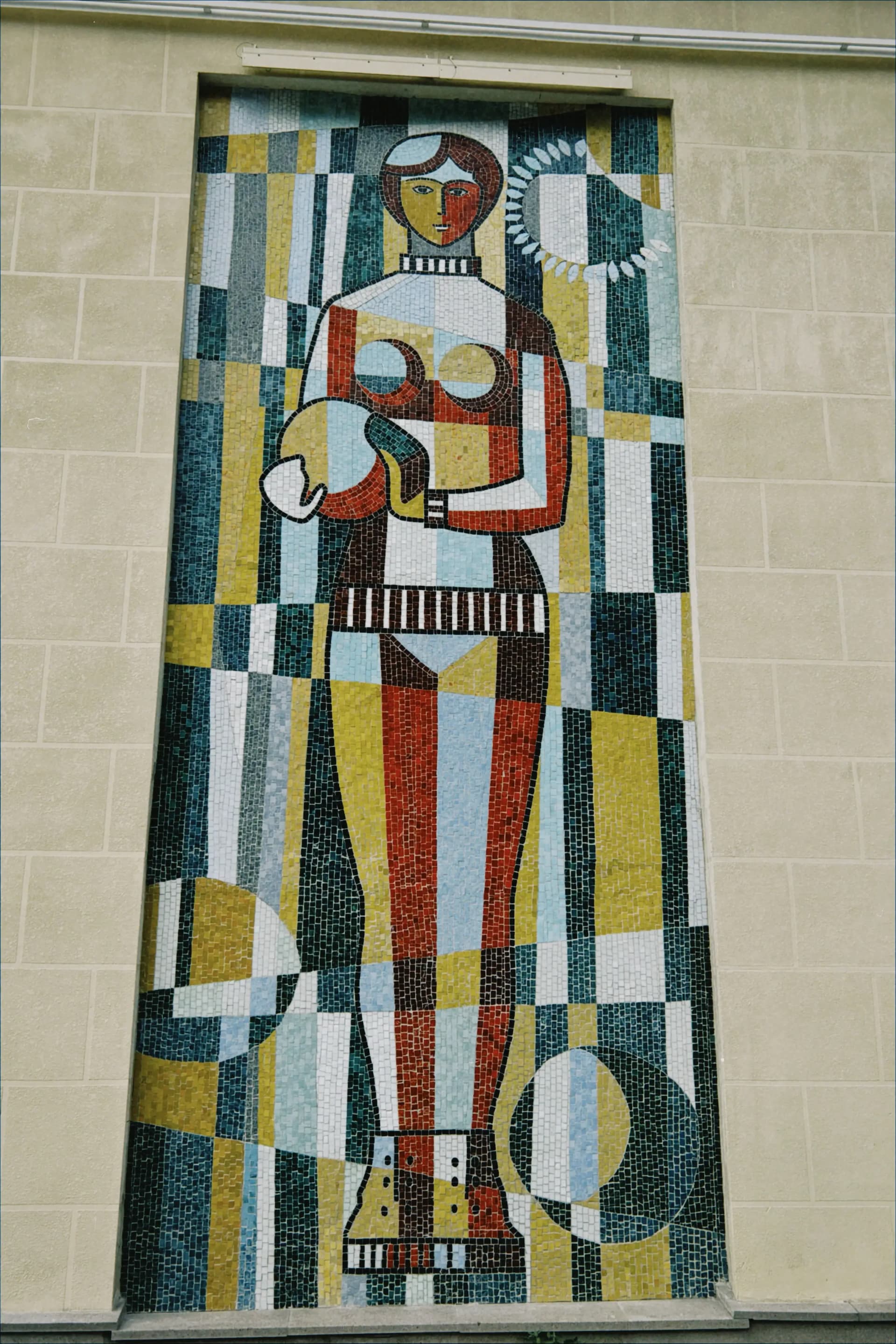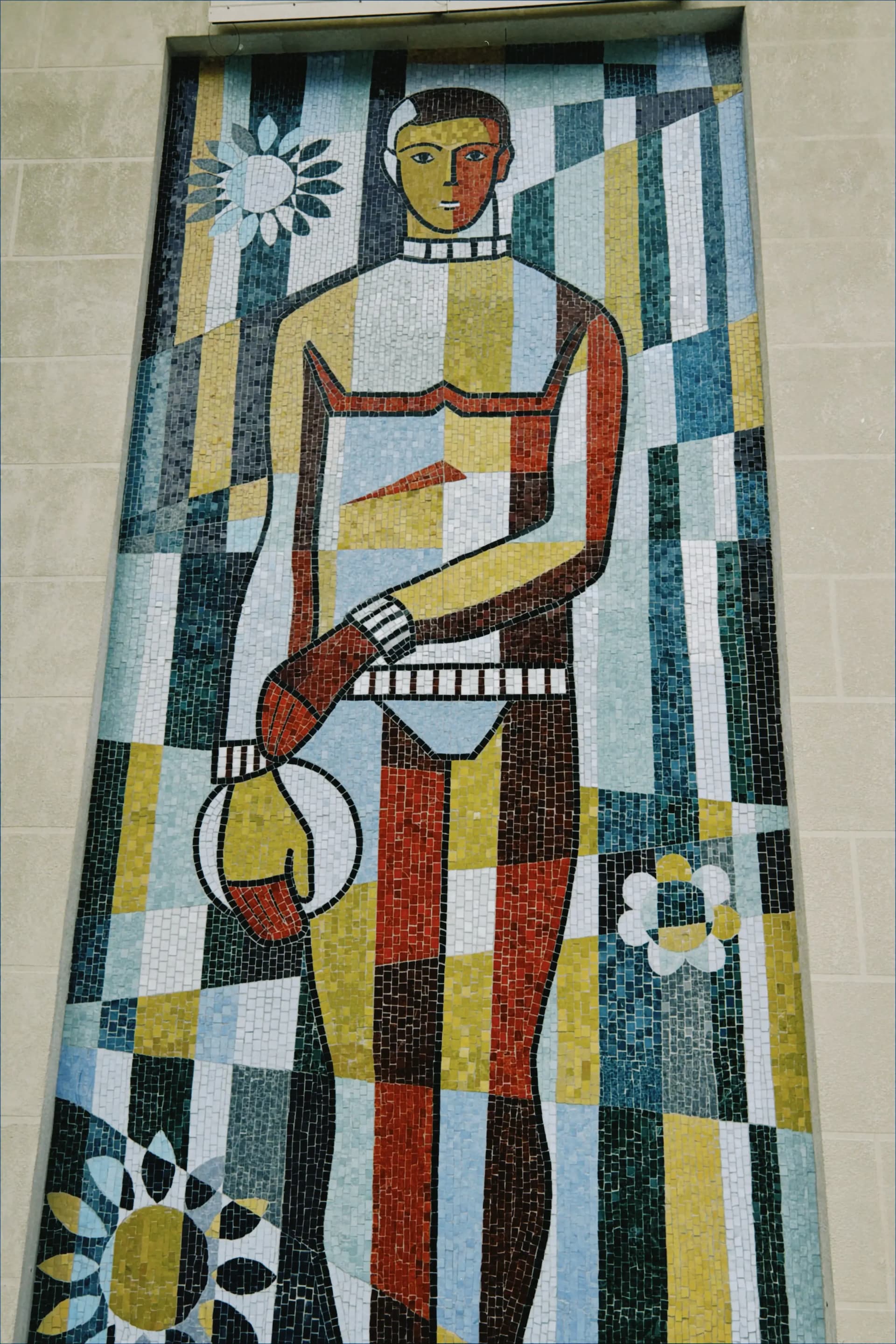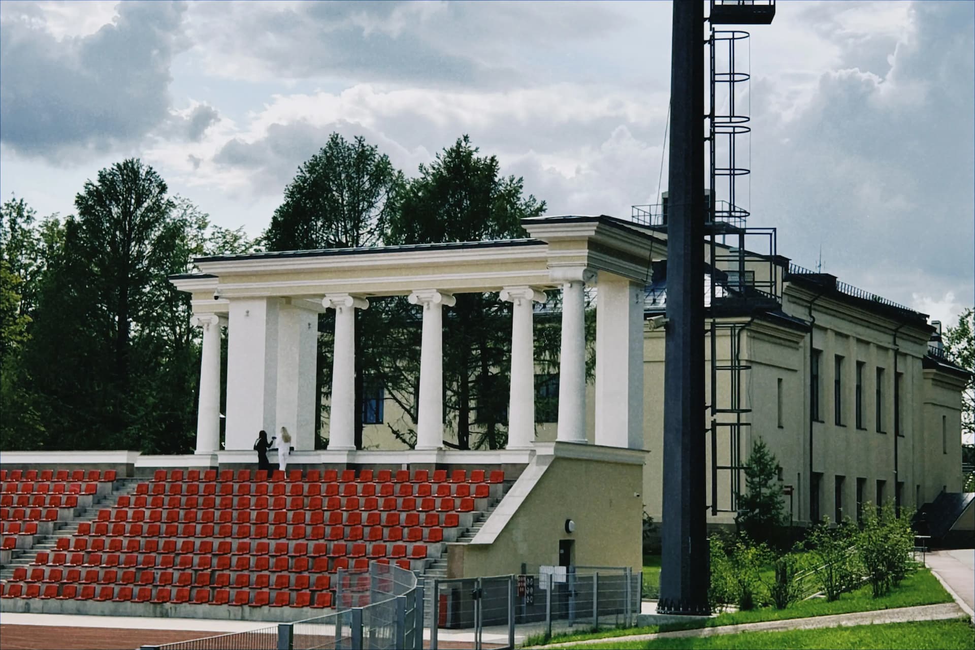 Здесь много симметрии классицизма — восстановлены входная группа и боковые колонны самого стадиона. По архивным фотографиям пересобрали два мозаичных панно на входе — девушку и юношу с мячом.