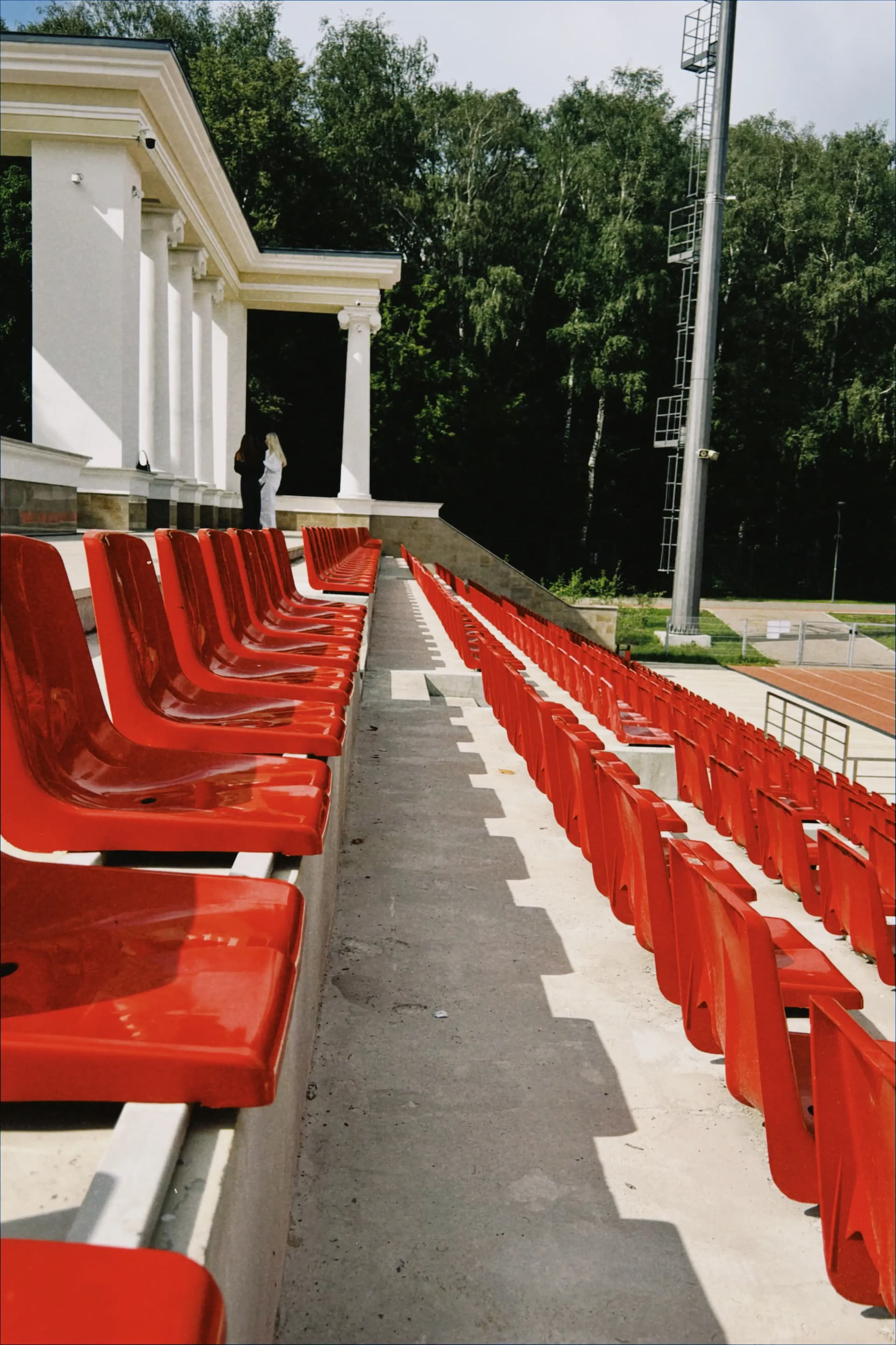 Цветовая гамма территории — серая и красная. Особенно лаконично в красных оттенках выглядят трибуны.