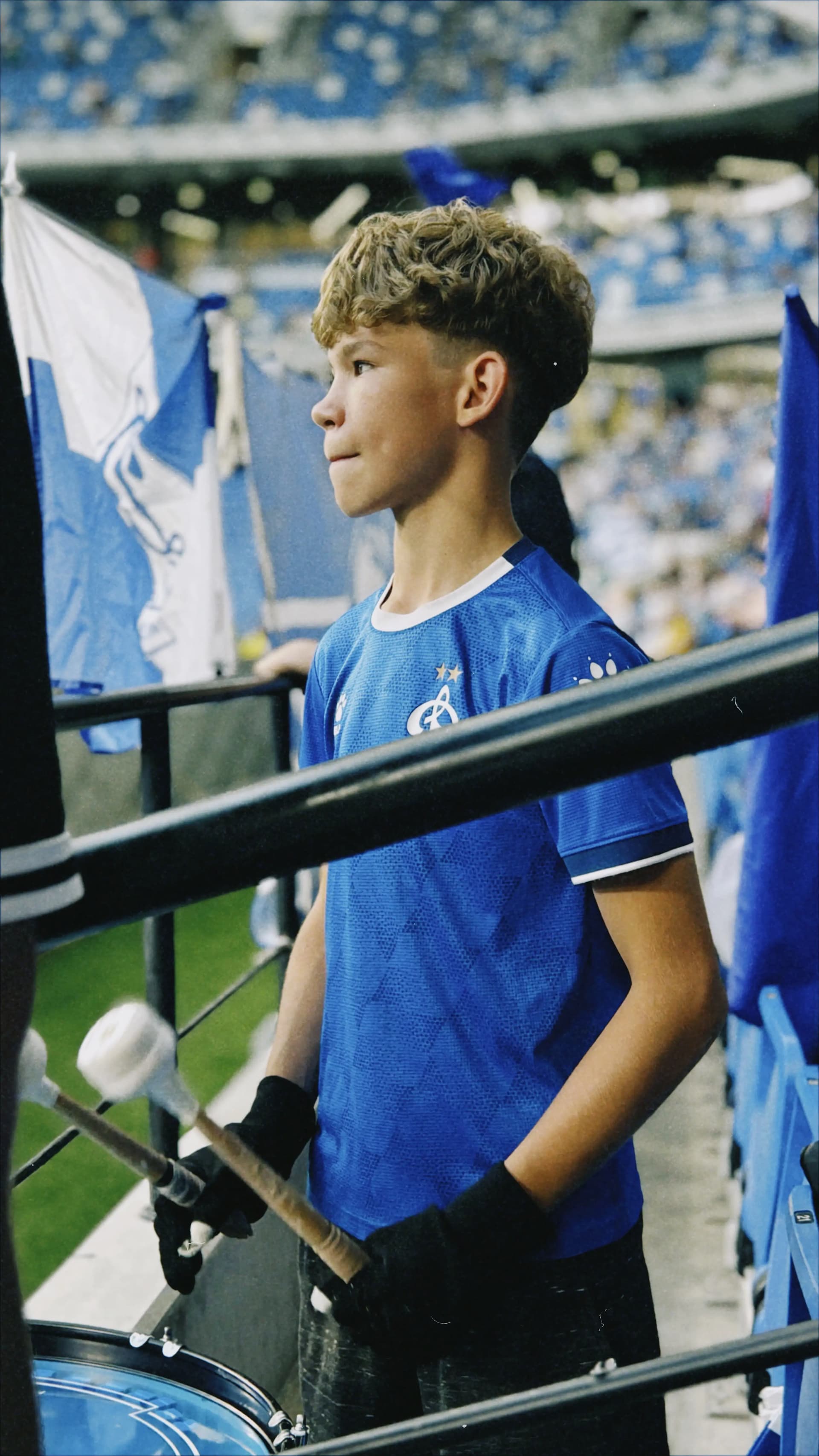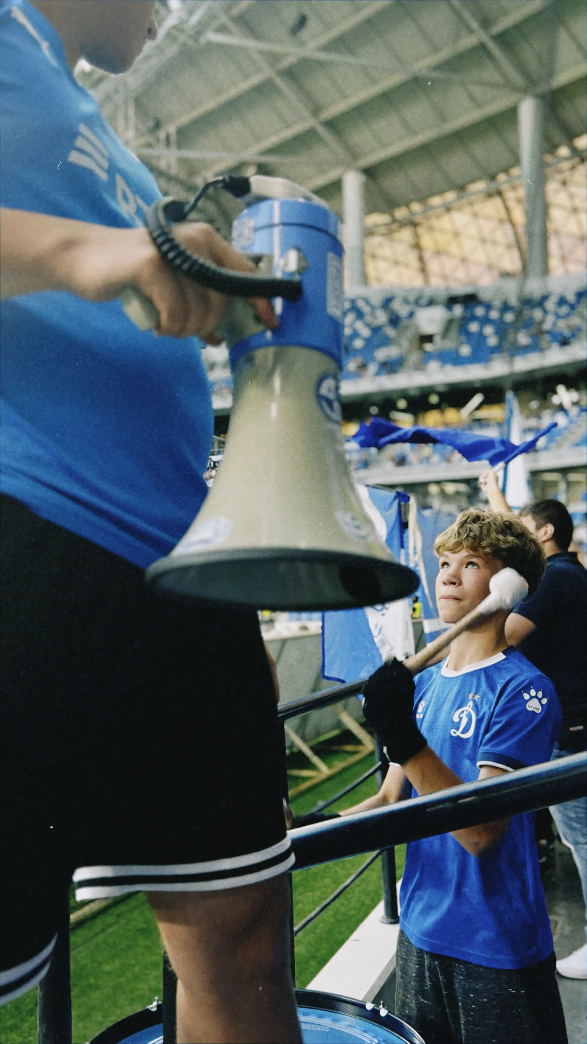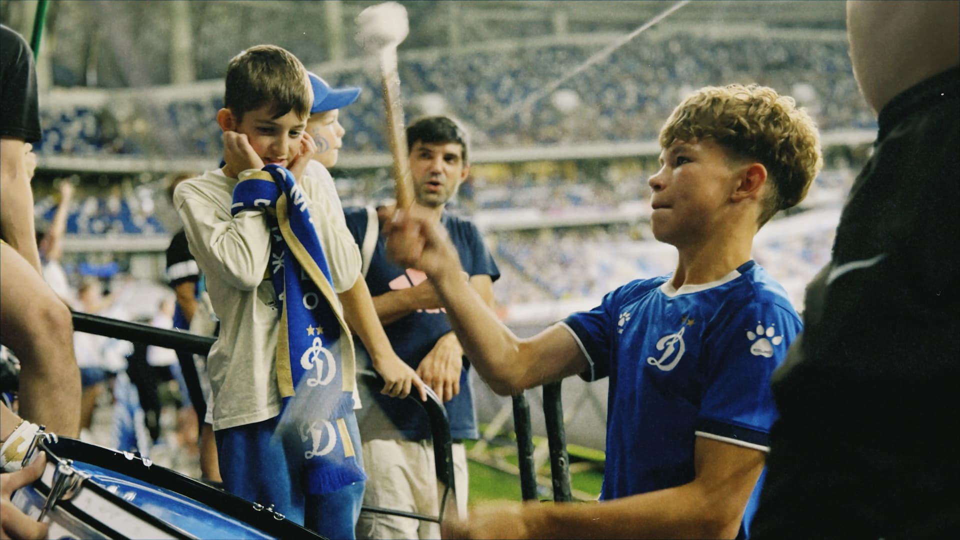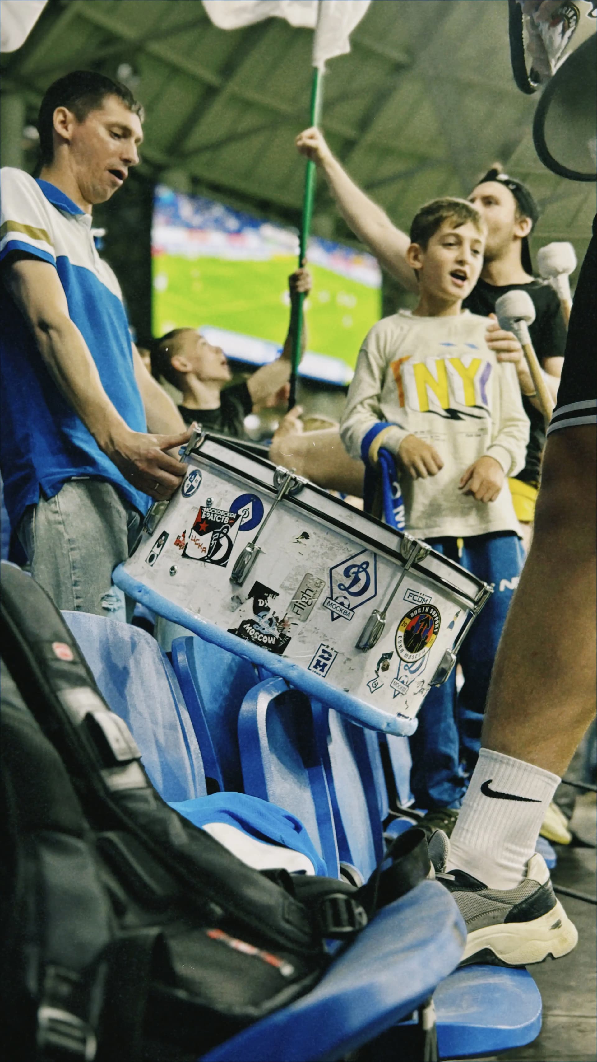 Освоиться на фанатской трибуне Динамо было легко — среди семей, добрых детей и расслабленных взрослых я испытала чувство гостеприимного дома. Периодически я следила за взаимодействием заводящего и барабанщика. Они подбадривали друг друга. Этот дружелюбный контакт придавал уверенности юному барабанщику. Его глаза светились всякий раз, когда он понимал, что у него все получается.