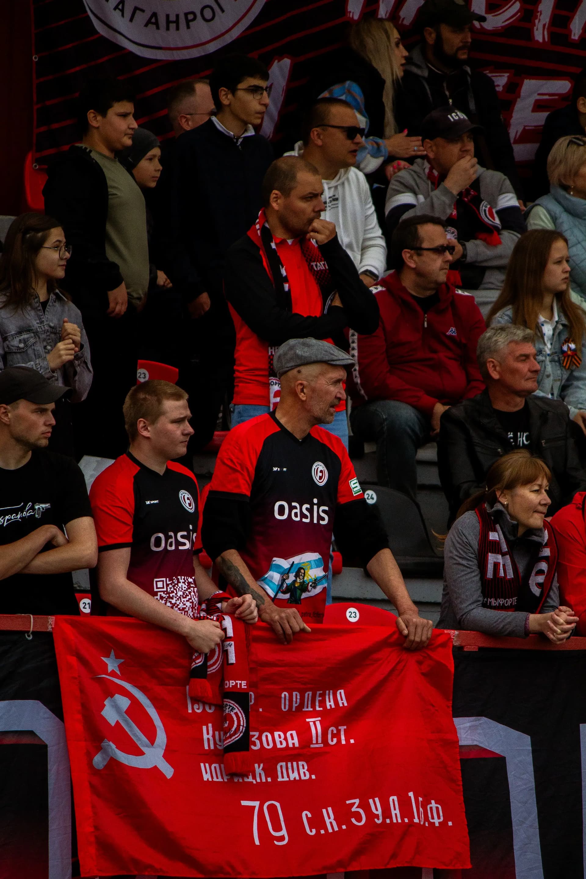 Стадион клуба расположен на окраине города. Приморский парк, один из самых лучших парков Таганрога по моему мнению, находится в 10 минутах ходьбы. Кассы рядом со входом, а сразу после турникетов — фаншоп с хорошим ассортиментом. Форма, шарфы, матчевые программки, значки, наклейки