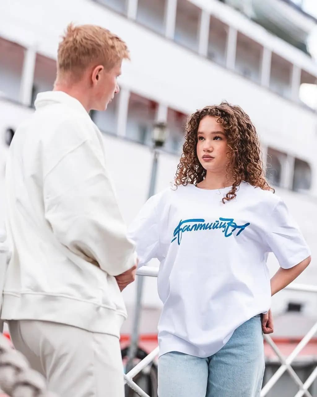 Презентация коллекции прошла на городской набережной. Фоном выступили весенние деревья и пришвартованный корабль