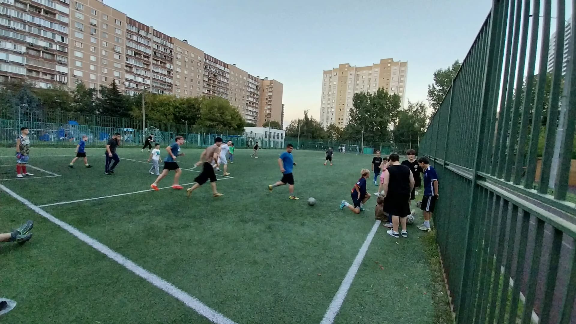 Недавно вечером шел, вижу, в темноте за решеткой телефоны светятся и компания сидит, 5-6 человек. Просто дети сидят, о чем-то тихо говорят. Ну, не прямо, чтоб клуб по интересам, а такое место, где можно потусить. Маленькая травка приятная, вот эта искусственная. Чего бы не посидеть, как бы домой не хочется, дома душно. Вот как-то вот так дворовый футбол. Песню "Душно" я тоже первый раз услышал именно там. Летом.