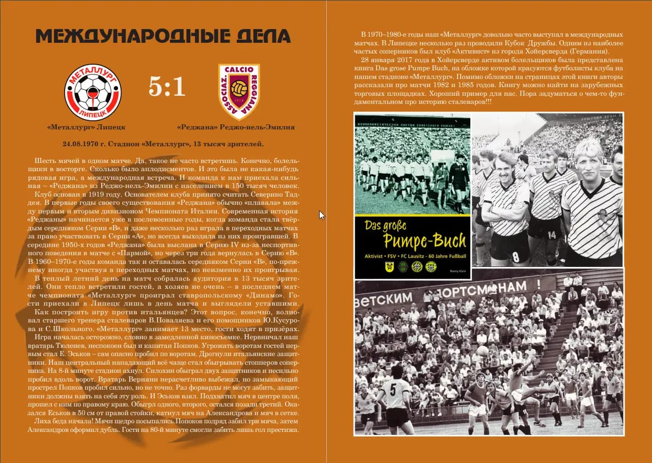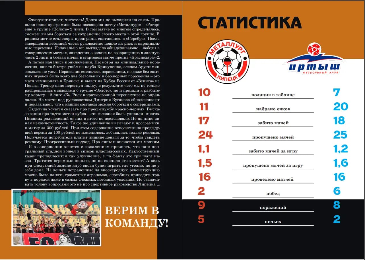 На сегодняшний день мы выпустили 11 программок, тираж каждого выпуска 30 штук, все экземпляры разошлись. При этом часть уходила по почте — сарафанное радио в среде ценителей футбольных программ работает отлично. Помимо липчан экземпляры наших брошюр уехали в Хабаровск, Брянск, Архангельск, Волгоград, Калугу, Муром, Северодвинск, Москву, Рязань, Воронеж, Екатеринбург, Пермь.