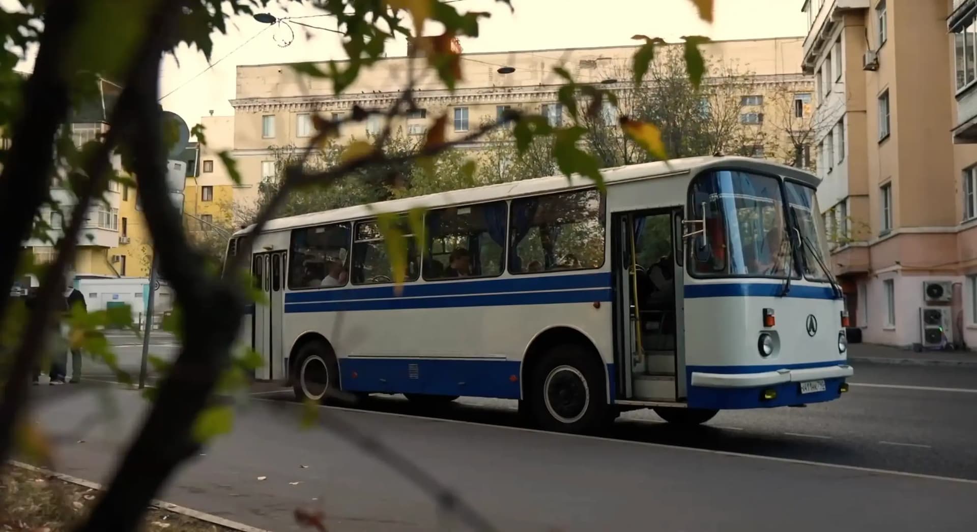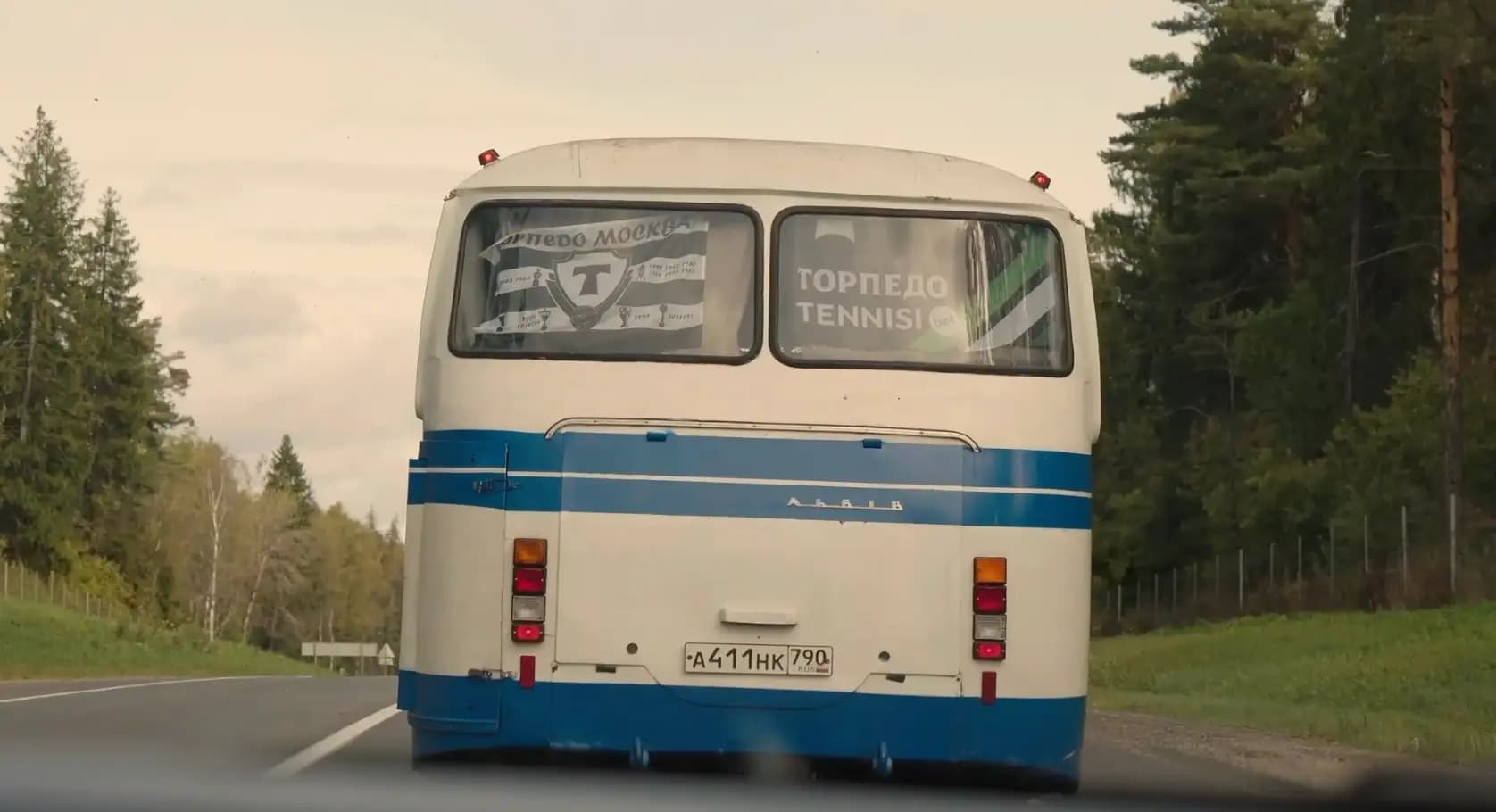 Словно сквозь время, лакированный автобус ЛАЗ и не менее блестящие «Волги» 1960-х годов провезли «черно-белую» трибуну по трассе М8.