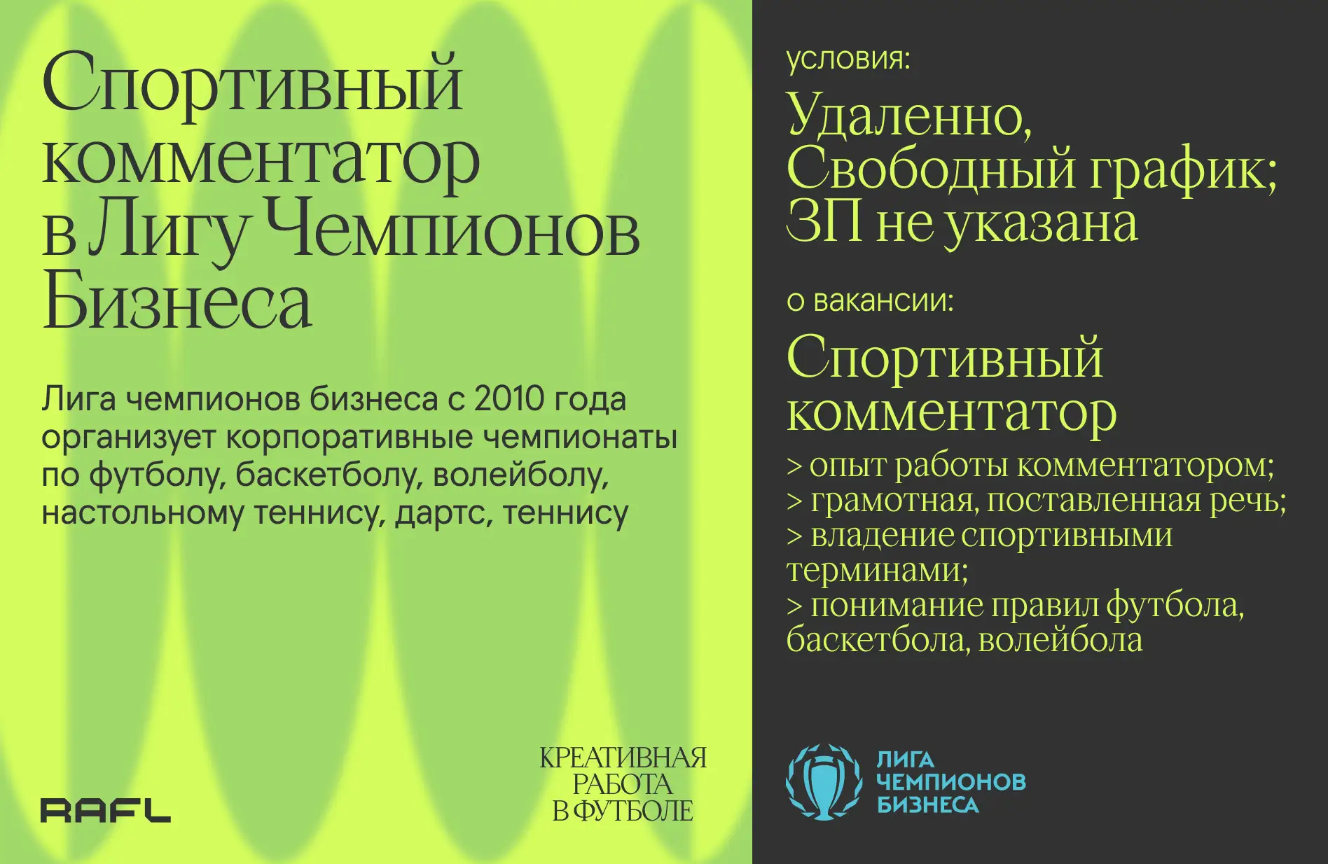 - Желательны навыки работы со спортивными трансляциями и понимание футбольной тематики;