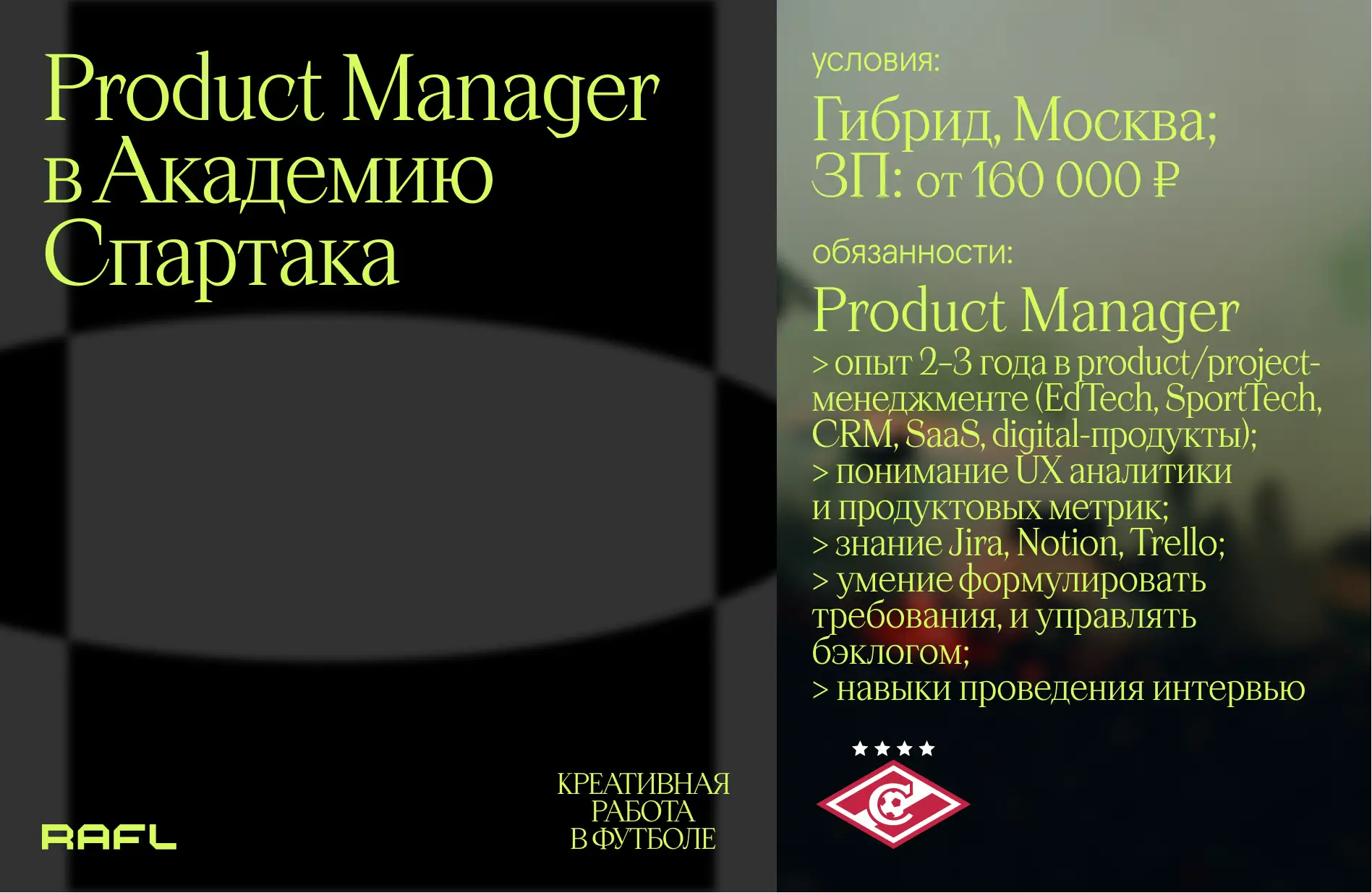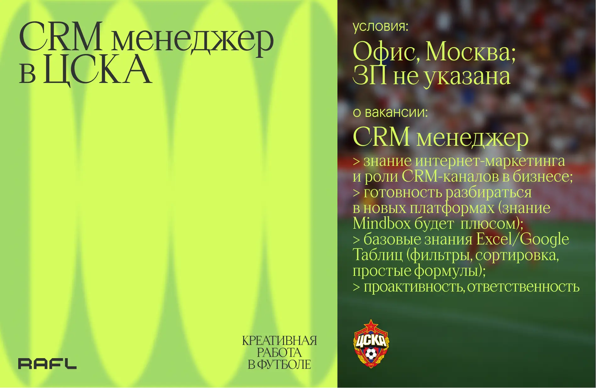 - Готовность работать в гибком графике, включая домашние матчи