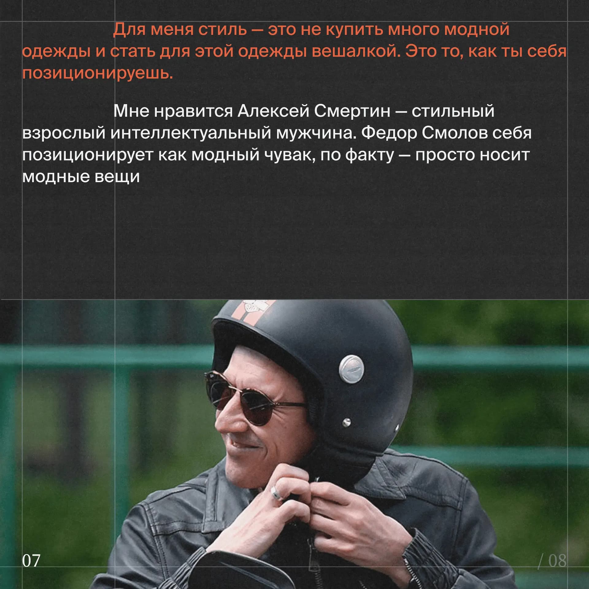Марджелой, в таком случае. Тем, старым, еще до ухода из собственного бренда в 2008-м. Но я стараюсь меньше смотреть на одежду и чаще — на какие-то смежные дисциплины — кино, музыка, даже новости. Для меня стиль — это не купить много модной одежды и стать для этой одежды вешалкой. Это то, как ты себя позиционируешь.