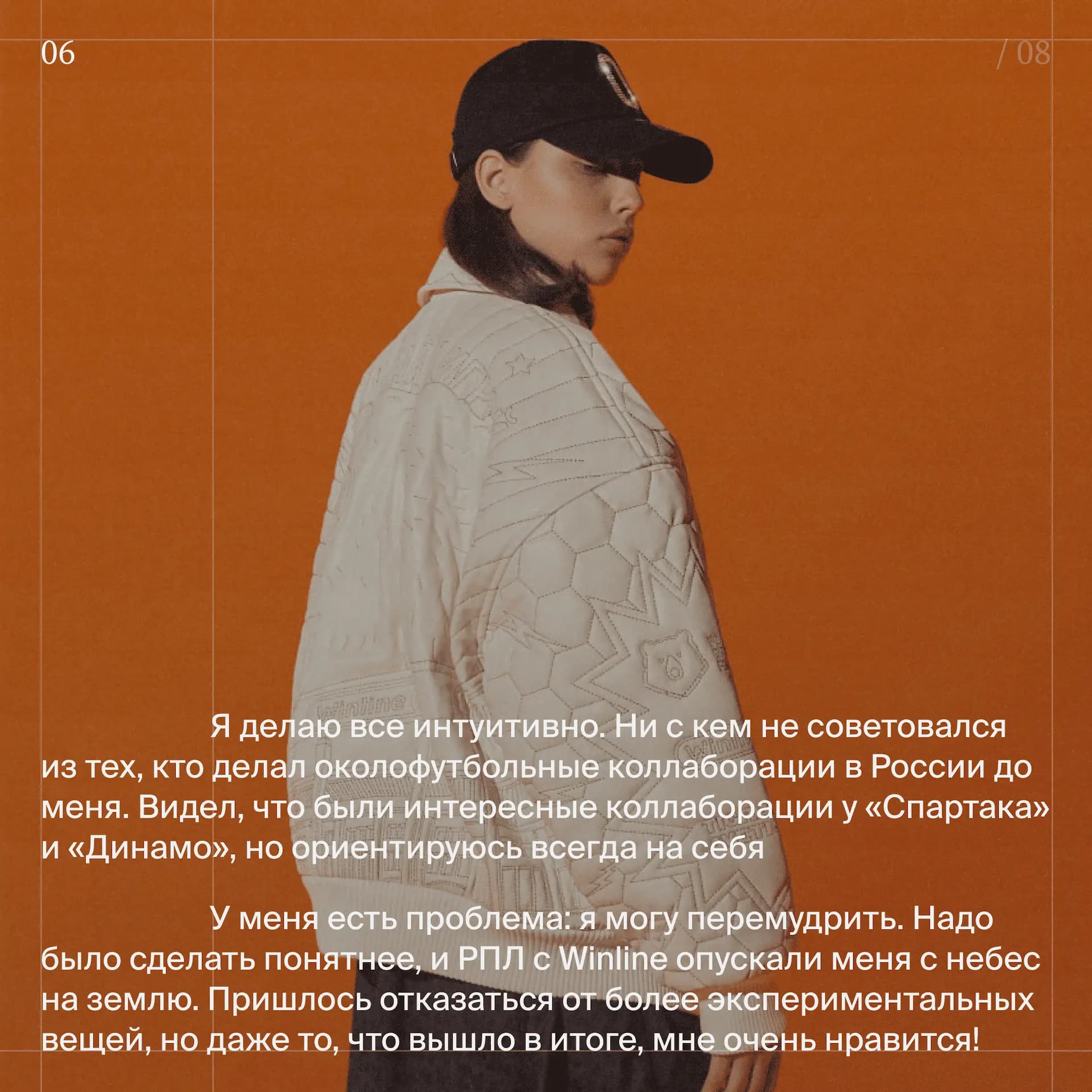 У меня процесс выстроен по-другому, я делаю все интуитивно. Ни с кем не советовался из тех ребят, что делали околофутбольные коллаборации в России до меня. Видел, что были интересные коллабы у «Спартака» и «Динамо», но ориентируюсь всегда на себя. Изначальные мысли были мои, мы много общались с РПЛ и Winline, поэтому не все дошло до финального производства.