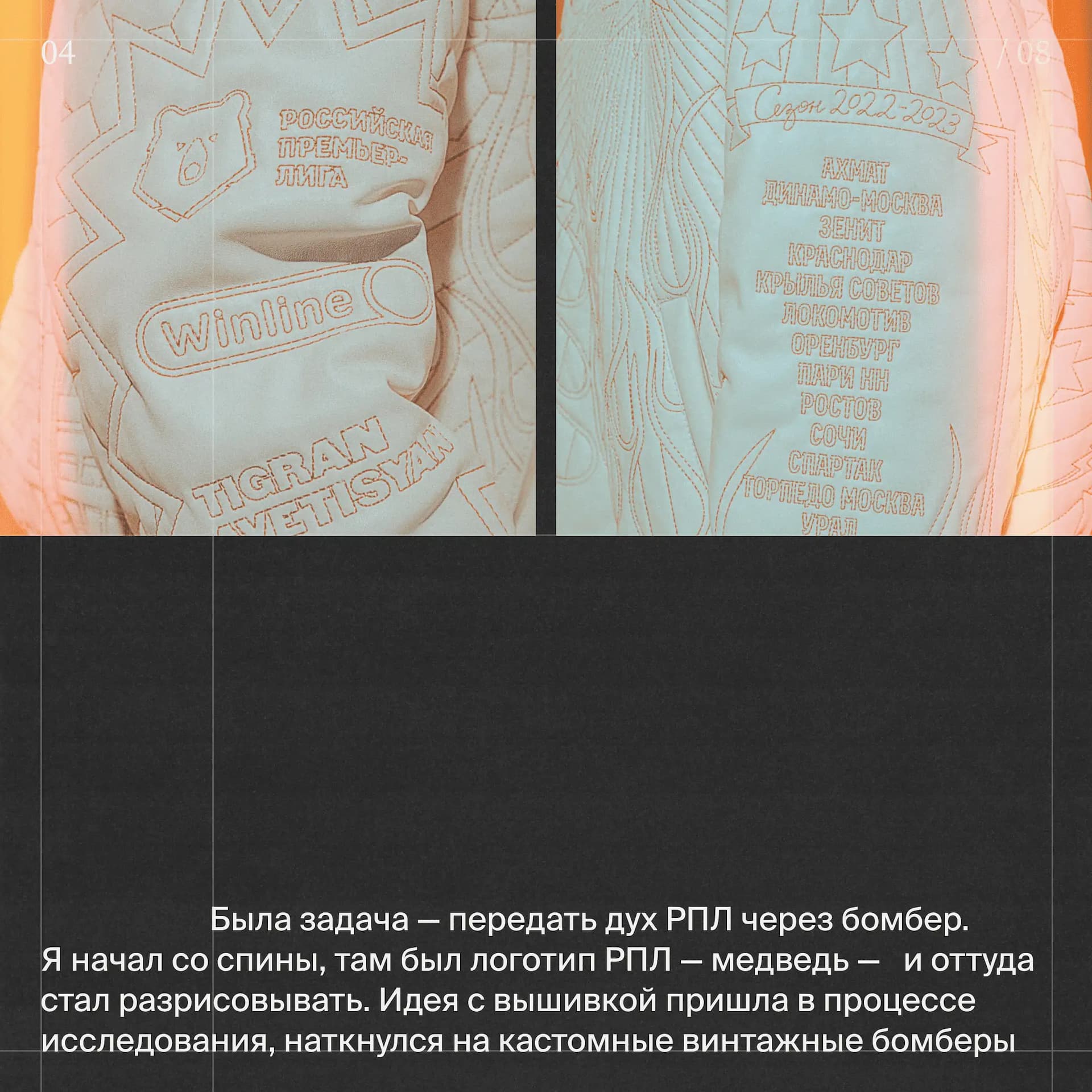 Была задача — передать дух РПЛ через бомбер. Я начал со спины, там был логотип РПЛ — медведь — и оттуда стал разрисовывать. Идея с вышивкой пришла в процессе исследования, наткнулся на кастомные винтажные бомберы. Подумал, классно было бы воспроизвести, но только увеличить количество вышивки.