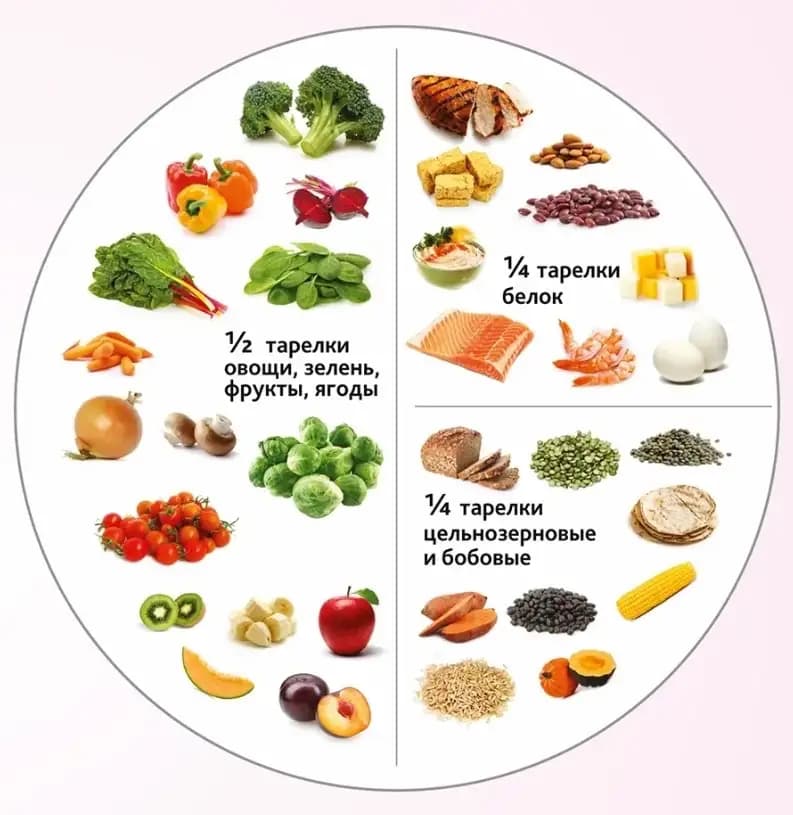 В каждый прием пищи важно стремиться к соблюдению правила тарелки: ½ тарелки – овощи, ¼ – белок (мясо, рыба, яйца), ¼ – сложные углеводы (крупы, хлеб).