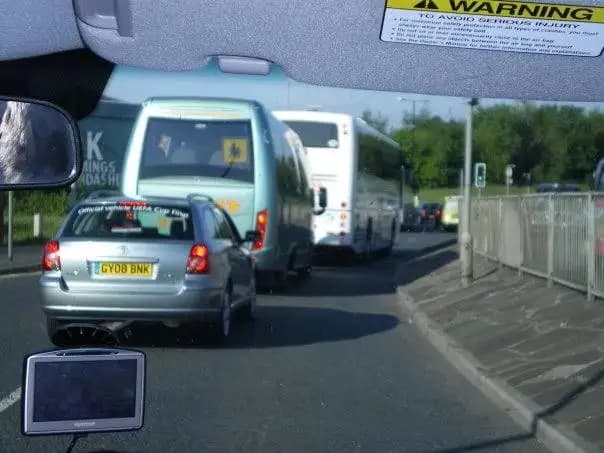 На подъезде к самому Манчестеру были жесточайшие пробки — мы, наверное, потратили около полутора часов там. В какой-то момент мы оглядываемся: все плотно стоит, 4 или 5 полос, едем очень медленно