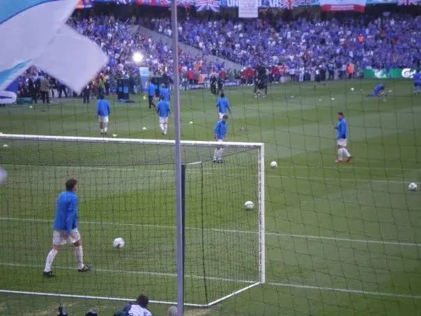 Это огромная и ревущая толпа. Когда мы зашли, стадион был практически полностью заполнен. Наша трибуна —там было, вероятно, тысяч пять, может, и меньше — против сорока пяти тысяч шотландцев. Это, конечно, пыль в сравнении, но мы шизили так, что просто перекричали болельщиков «Рейнджерс»