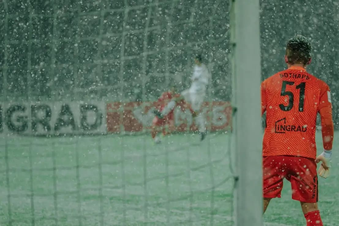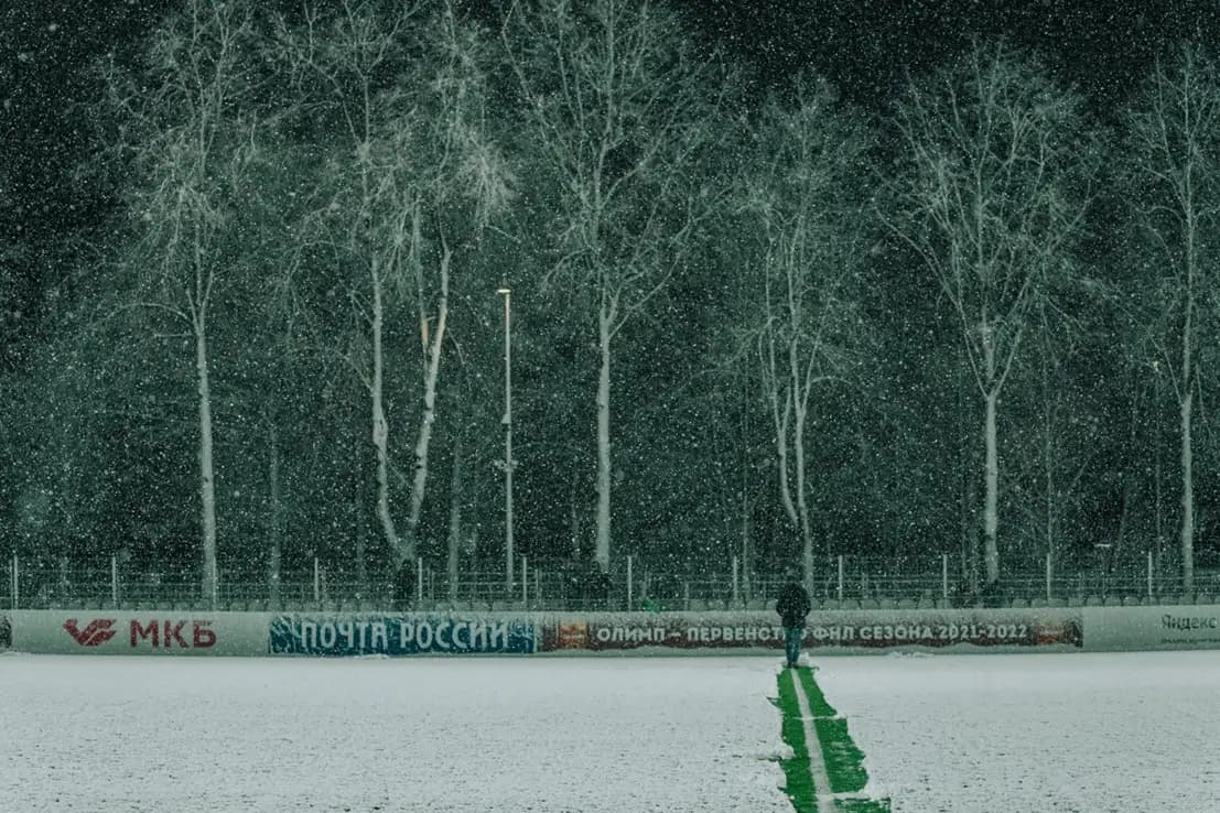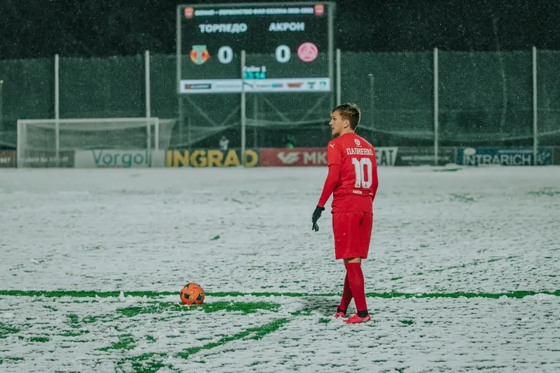 7 апреля 2022 года. Матч «Торпедо» — «Акрон». Внезапный апрельский снегопад. Камера в полиэтиленовом пакете, пальцы замерзли, объектив в снегу. Но кадры — магия. Самое красивое освещение — когда погода будто бы играет против тебя. Нужно всегда иметь при себе дождевик, перчатки и бленду. Никогда не забывайте бленду)