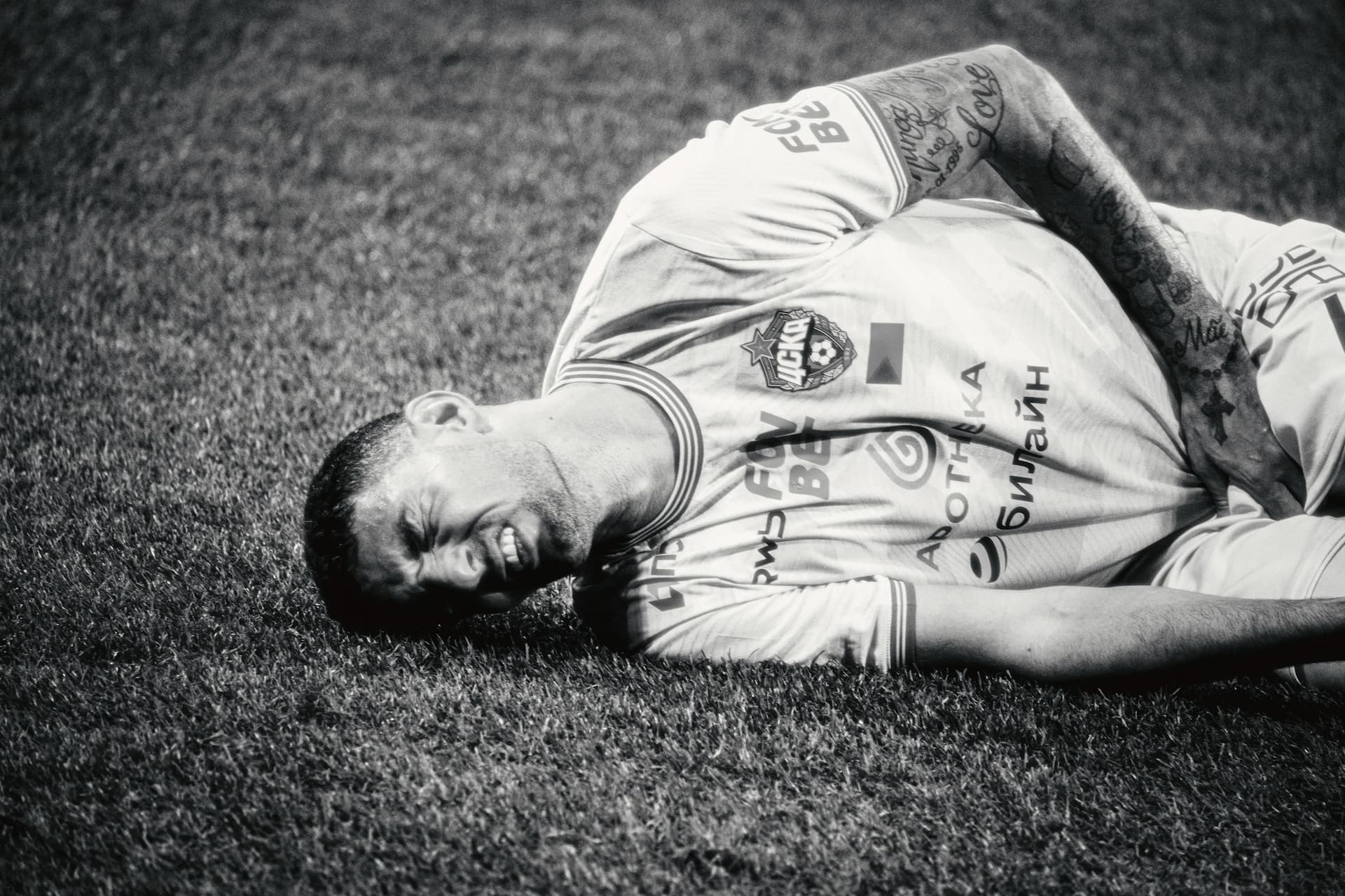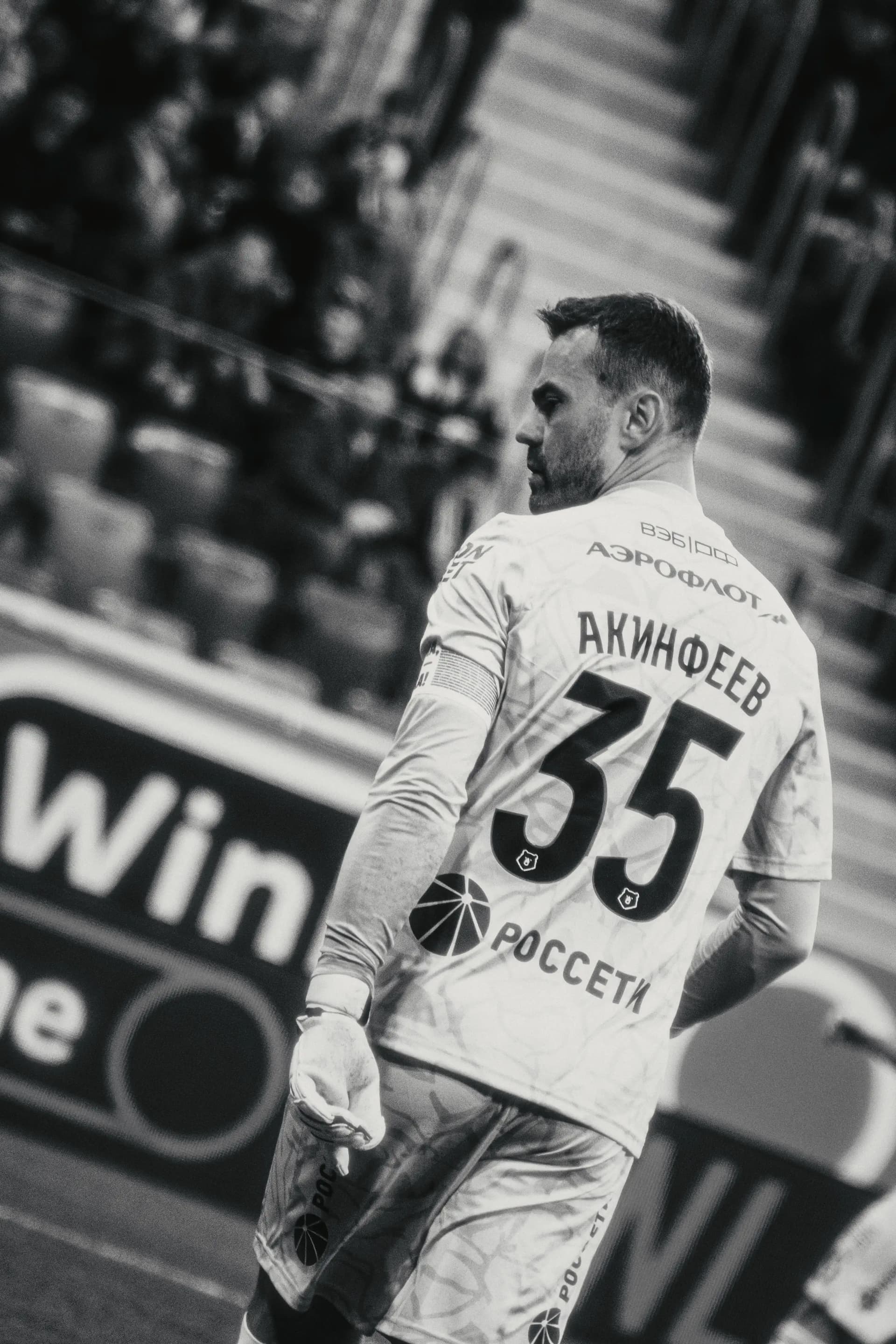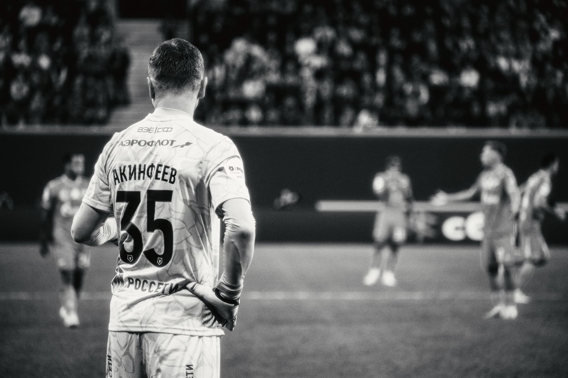 Ерохин выходит на поле с повязкой, эта деталь сразу вносит дополнительный контекст — возможно, играет через боль. Но все равно пытается внести в матч свой вклад.