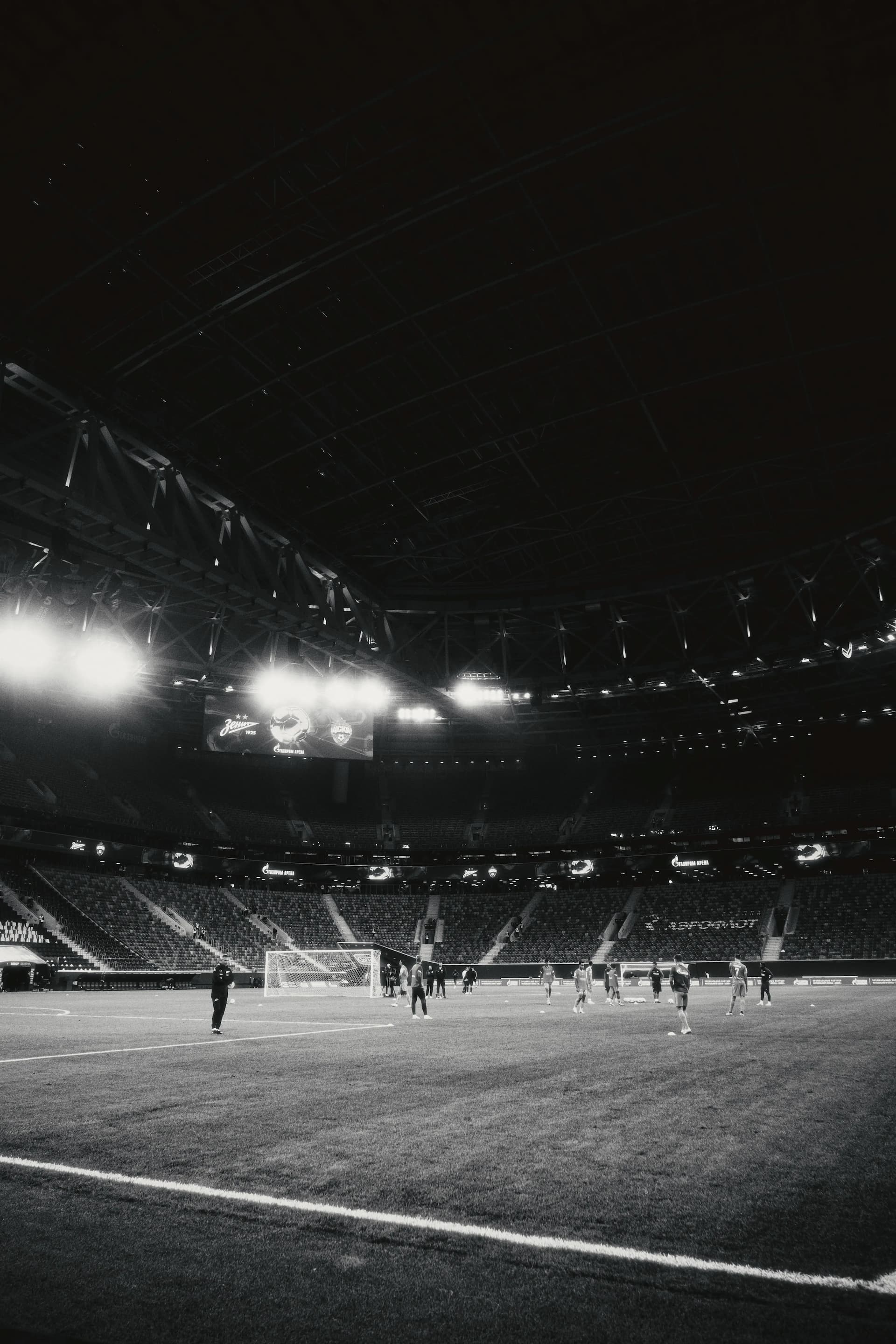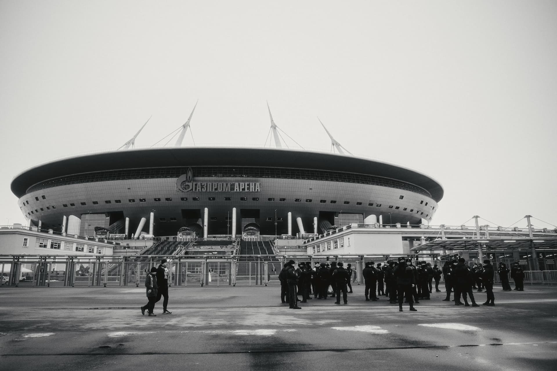 На содержательном уровне с самого начала, еще у стадиона события зарифмовались не с ожиданиями, а с той самой гнетущей погодой. У «Газпром Арены», огромной черной массой кучкуются силовики. Стоял минут пять, раздумывая, хорошая ли идея, доставать при них камеру, и делать кадр. Обратит ли кто-то из них внимание? Встретит неодобрительно? На выходе — безразличие. В голове начинают мелькать сюжеты разных антиутопий. Последняя из прочитанных — «Процесс» Кафки. Интересно, как бы он ощущал себя здесь, в Петербурге, в наши дни?