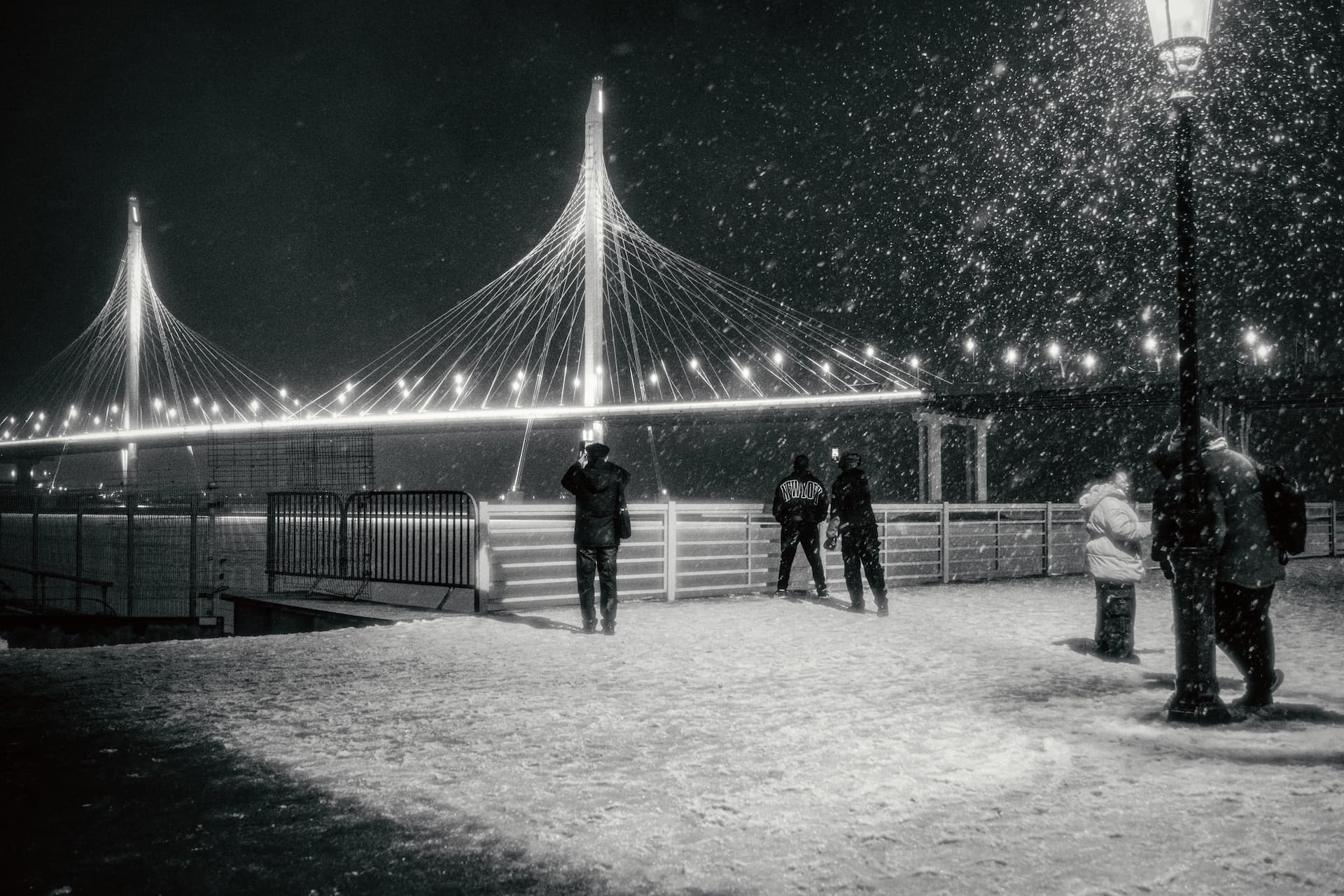 На улице темно, снегопад. Кто-то из болельщиков остановился под светом теплого фонаря, чтобы сделать фото. Единственное желание — обрести надежду. Если ее не вселил матч, то обязательно сделает тот, кто рядом.